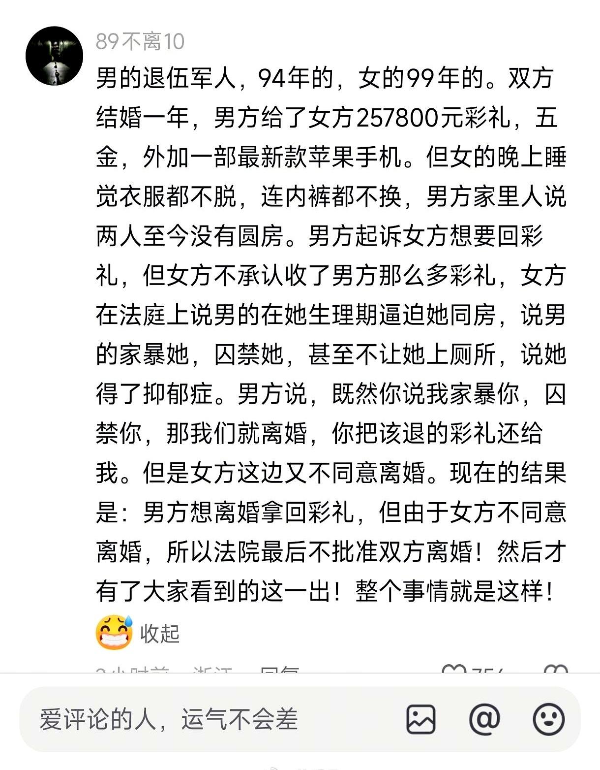 今天看到个事儿,真把人看懵了。 男方给了25万多彩礼、4万多首饰和一部9400元手机,把她娶回;婚后近一年,女方因家暴抑郁住院却仍恋着这段二婚关系,夜里穿着睡觉、避开同房。 男方公开要退彩礼,女方称都花了。 表面像骗婚,实则可能是受伤后的自我防御;彩礼不是性权利的凭证,公众把受害人迅速贴上“贪财”标签,是另一种暴力。 身边太多反面教材证明:钱进婚姻不等于尊重。 这事,到底是法律、道德,还是常识在缺位?