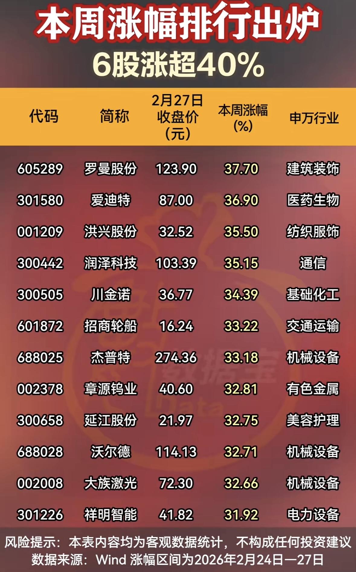本周涨幅榜新鲜出炉,6只股票涨幅超40%,这谁能忍住不围观!像豫能控股,涨幅达到46.27%,参股投资先天算力,潜力无限;金正大也不甘示弱,以46.23%的涨幅紧跟其后,磷化工板块的热度可见一斑。明阳电路、通源石油、菲利华等也都表现出色。 不过,股票市场变幻莫测,这些涨幅靠前的股票虽然眼下风光,但后续走势谁也说不准。投资还是得谨慎,不能光看短期涨幅就盲目跟风。大家且看且思考,说不定能从这涨幅榜里找到新的投资思路。