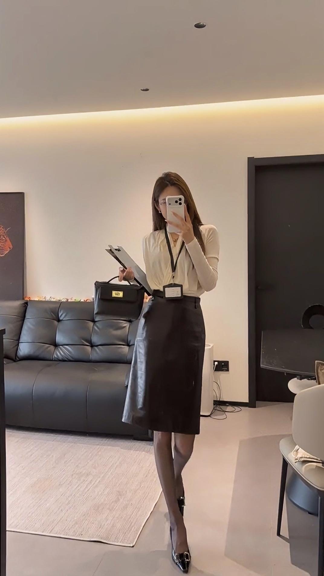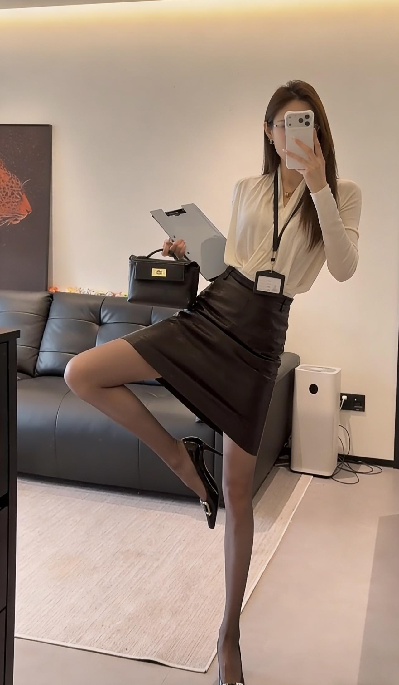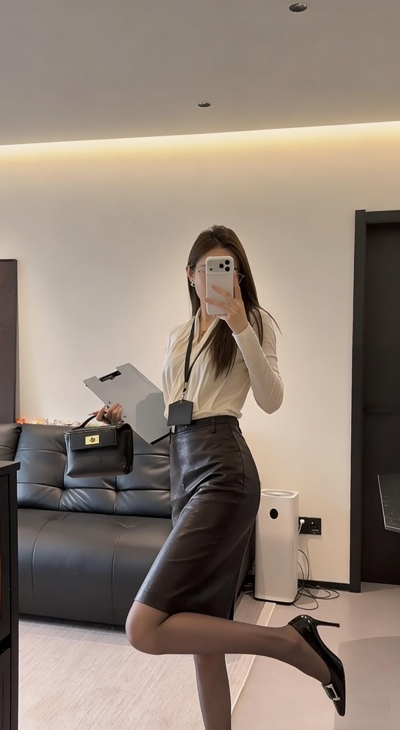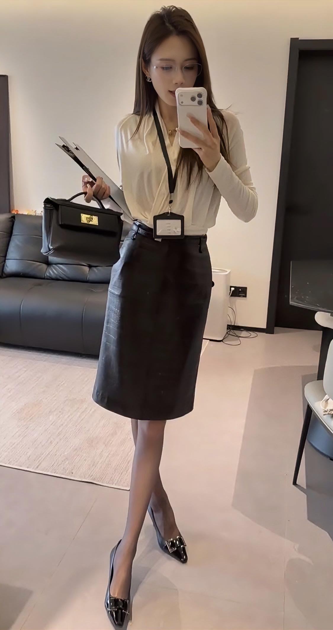 今日穿搭推荐是典型的干练职场风,整体风格专业又不失精致感: • 上衣:米白色V领交叉设计长袖衫,材质垂坠感好,既显气质又能修饰颈部线条,同时保证了舒适感。 • 下装:深棕色皮质及膝铅笔裙,质感高级,版型修身,能很好地勾勒腰线,提升整体利落感。 • 配饰:黑色皮质手提包、黑色尖头金属扣高跟鞋,搭配黑丝,细节处强化了职场专业感,同时增添了一丝精致与气场。 这套穿搭非常适合以下场景: 1. 正式办公场景:日常办公室通勤、部门会议、客户对接等,专业又得体。 2. 商务场合:商务洽谈、项目汇报、行业峰会等,能展现出专业、干练的职业形象。 3. 轻商务社交:公司年会、行业晚宴等半正式场合,既符合着装要求,又能凸显个人品味。