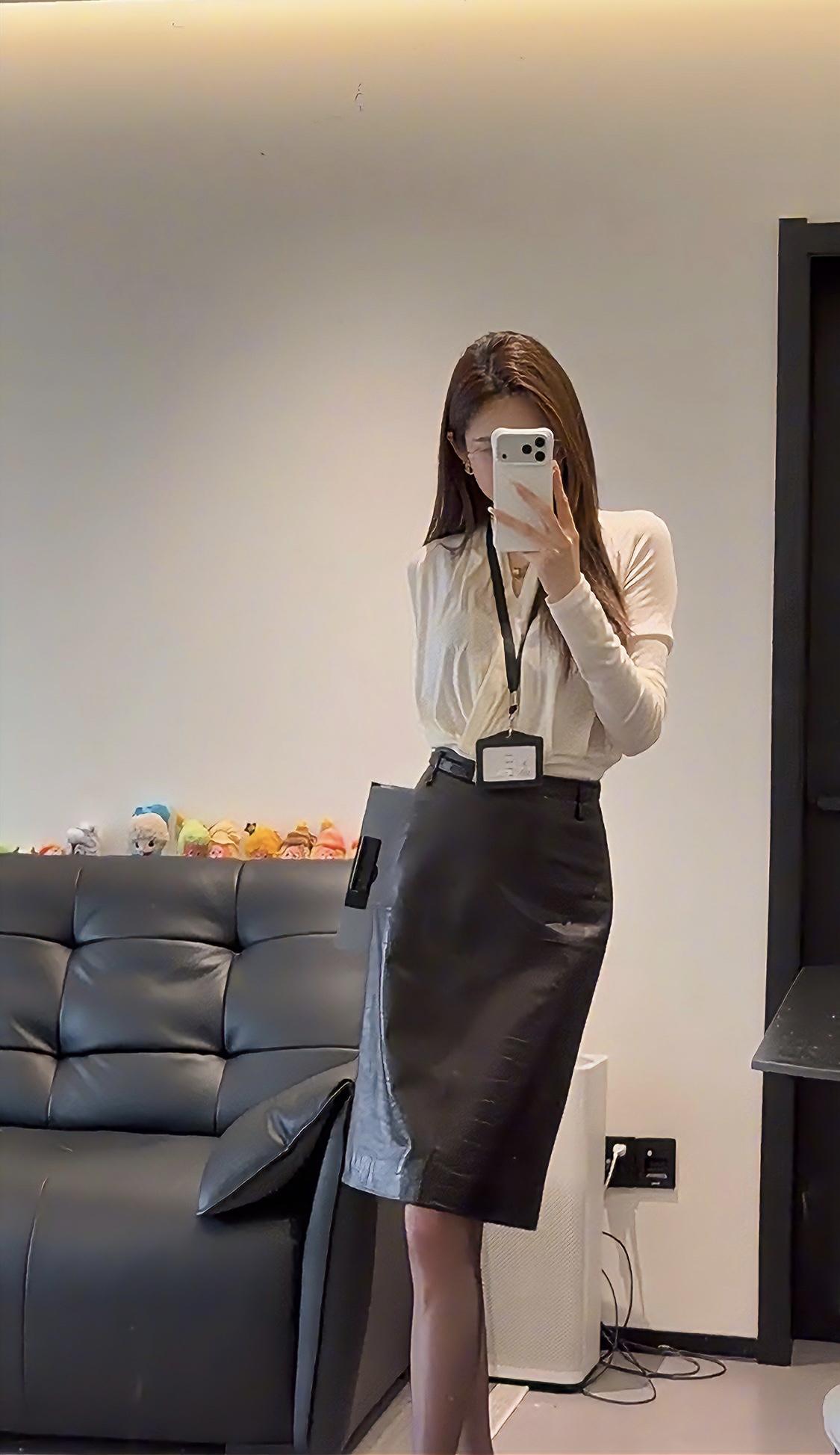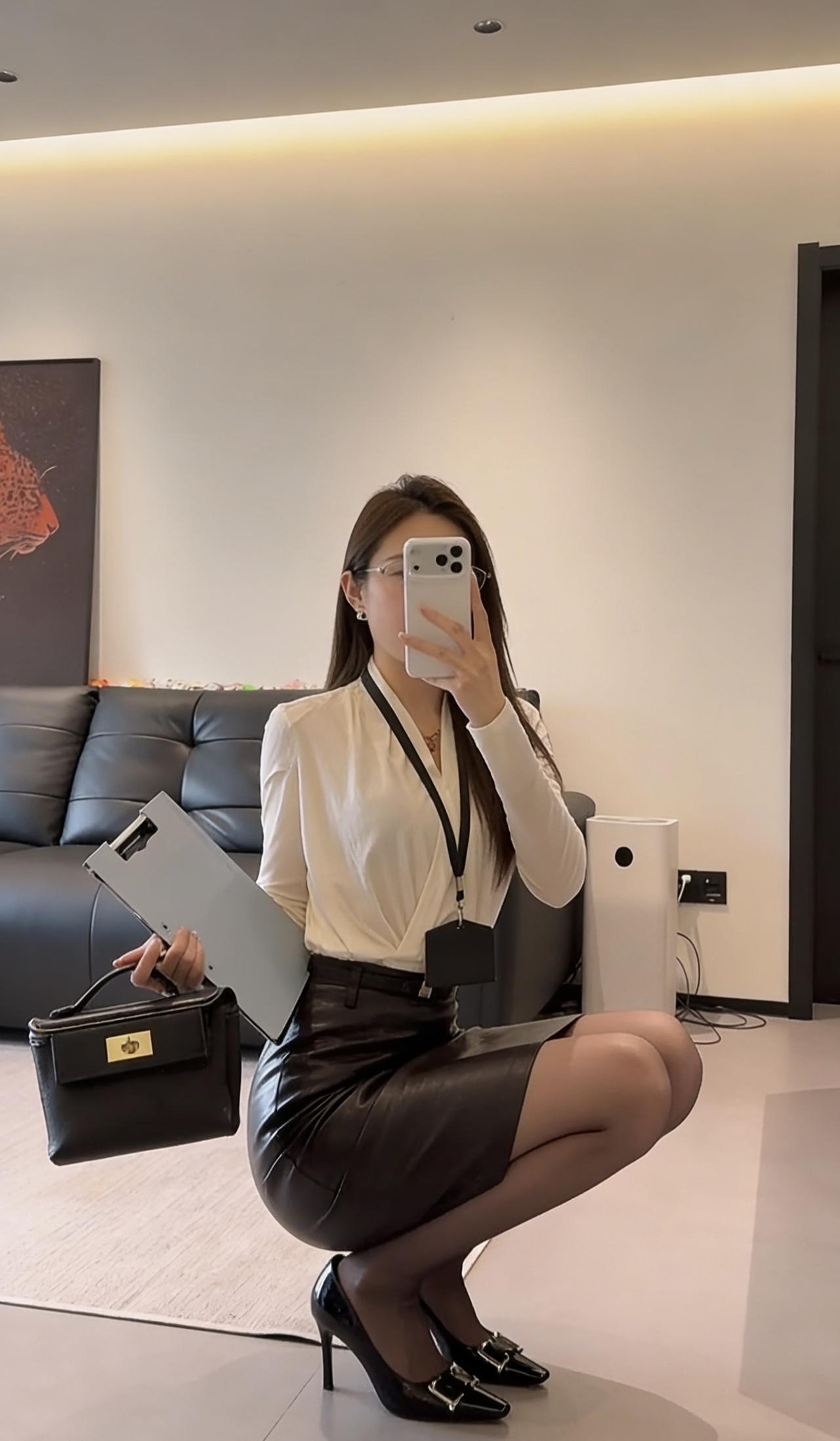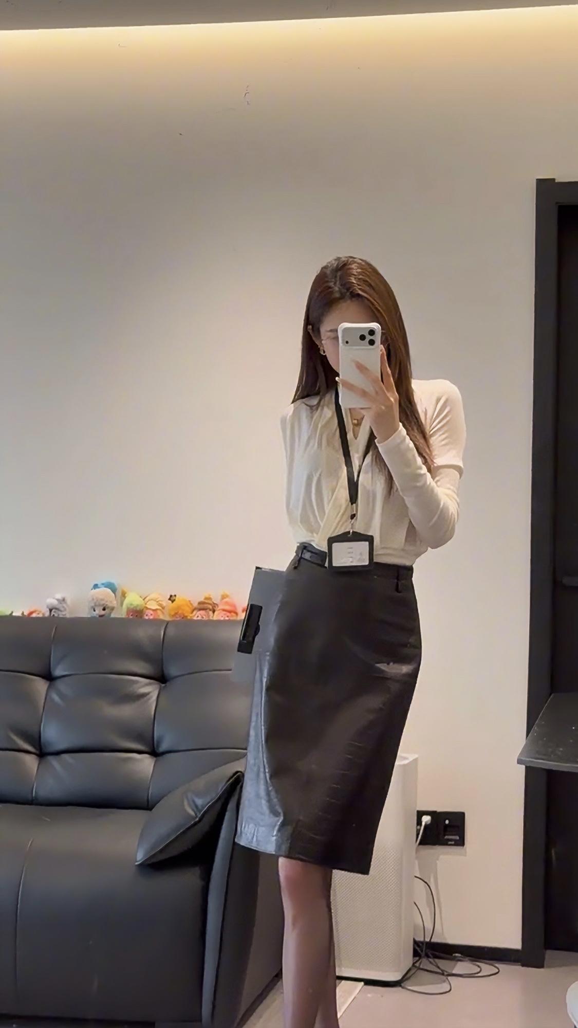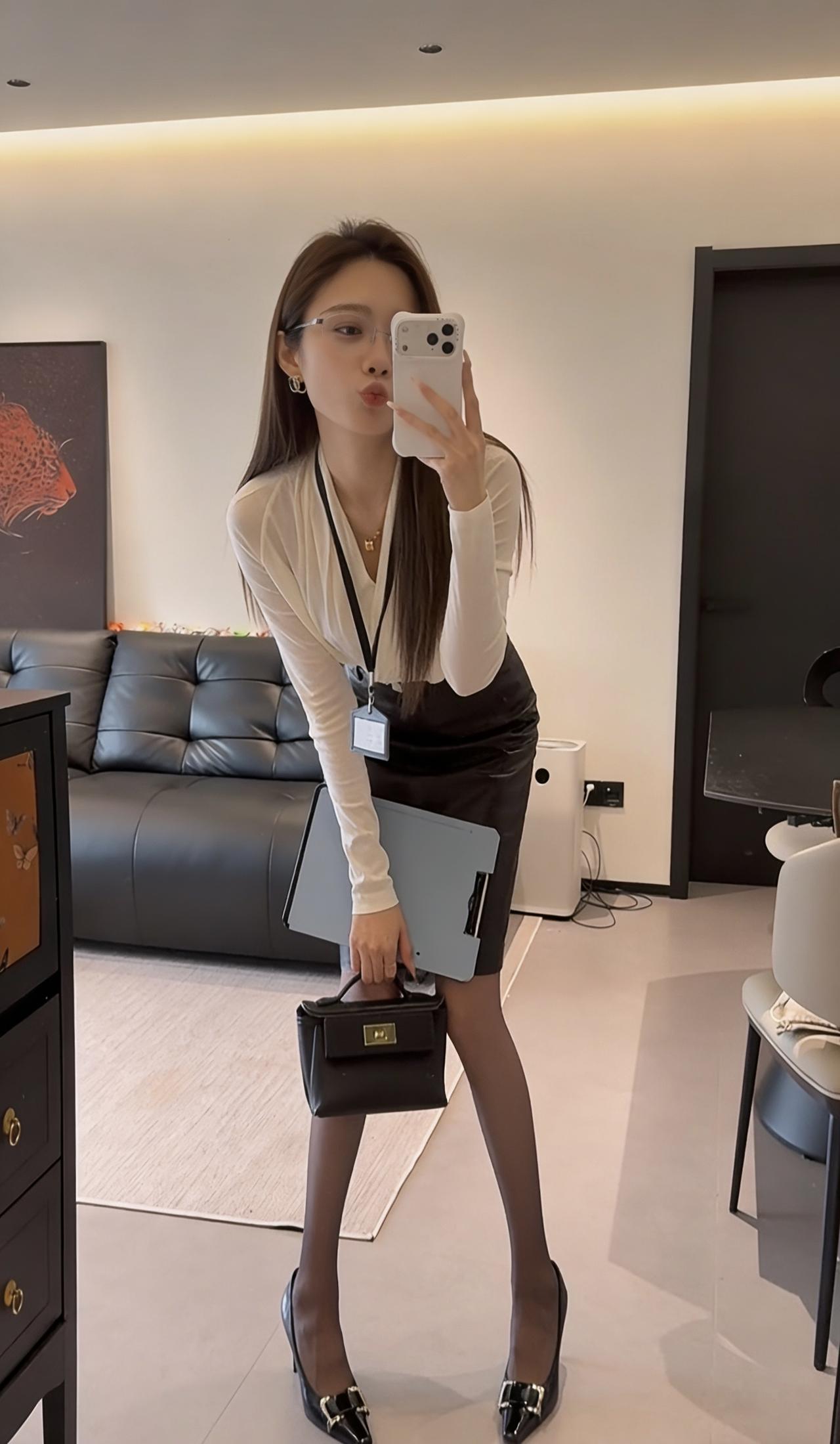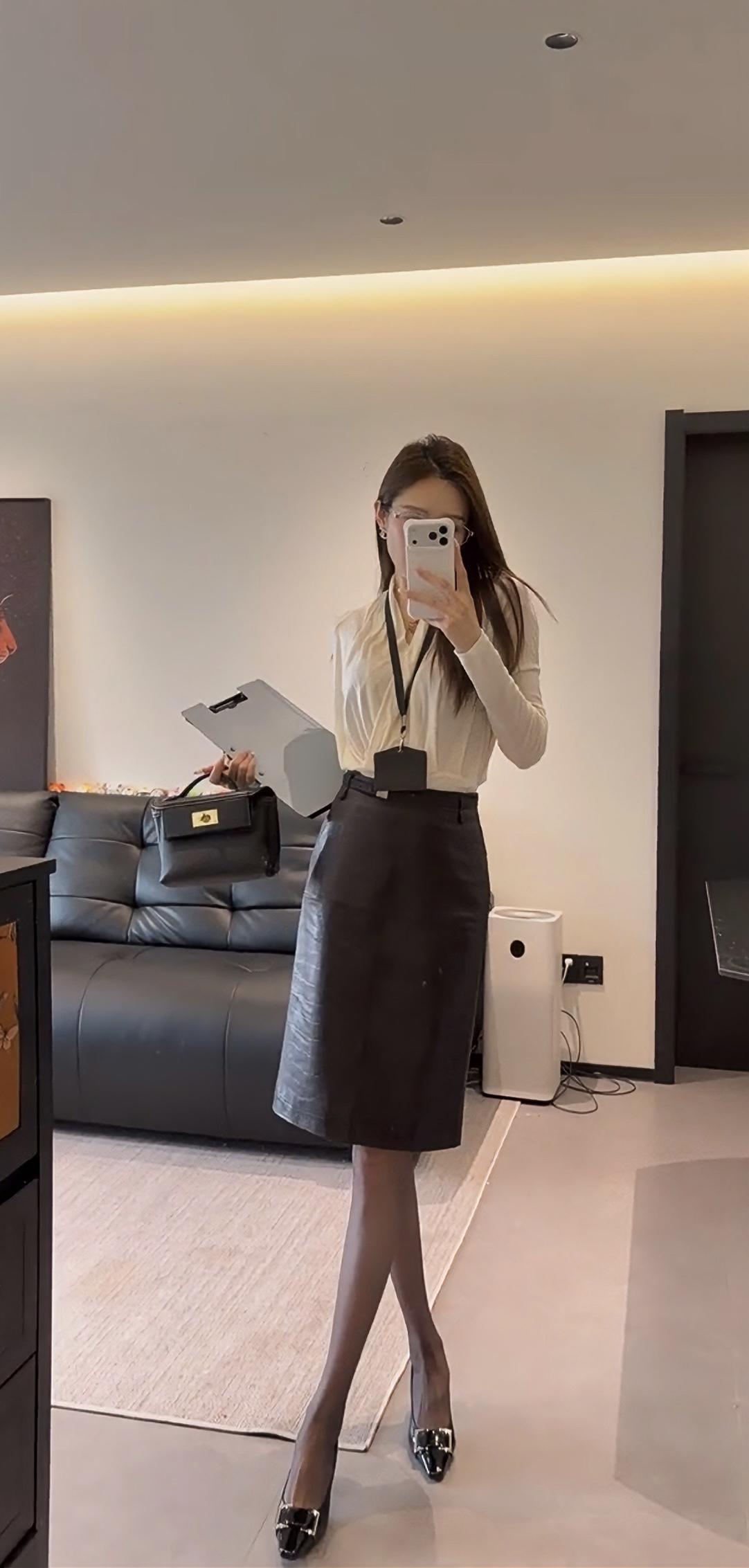 今日穿搭推荐是典型的干练职场风,整体风格专业又不失精致感: • 上衣:米白色V领交叉设计长袖衫,材质垂坠感好,既显气质又能修饰颈部线条,同时保证了舒适感。 • 下装:深棕色皮质及膝铅笔裙,质感高级,版型修身,能很好地勾勒腰线,提升整体利落感。 • 配饰:黑色皮质手提包、黑色尖头金属扣高跟鞋,搭配黑丝,细节处强化了职场专业感,同时增添了一丝精致与气场。 这套穿搭非常适合以下场景: 1. 正式办公场景:日常办公室通勤、部门会议、客户对接等,专业又得体。 2. 商务场合:商务洽谈、项目汇报、行业峰会等,能展现出专业、干练的职业形象。 3. 轻商务社交:公司年会、行业晚宴等半正式场合,既符合着装要求,又能凸显个人品味。