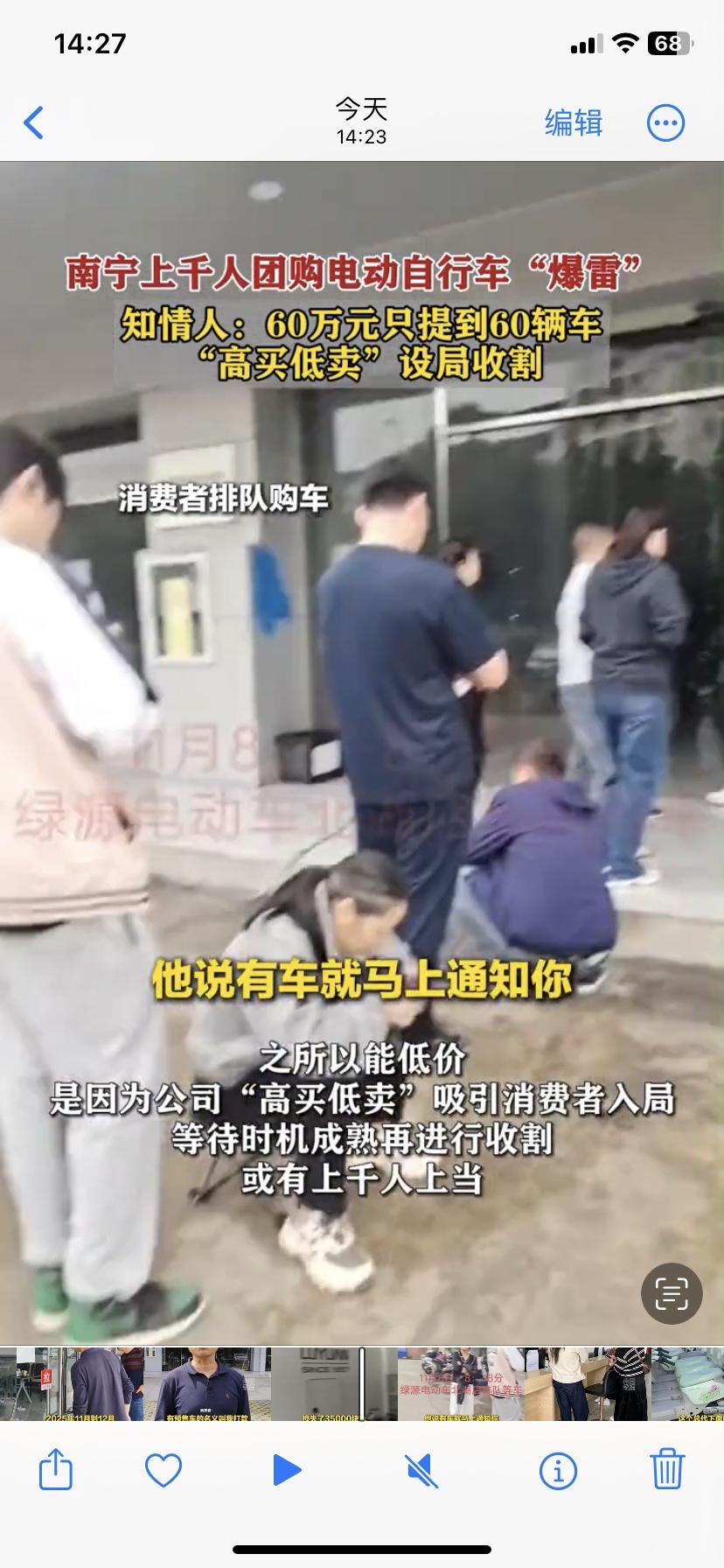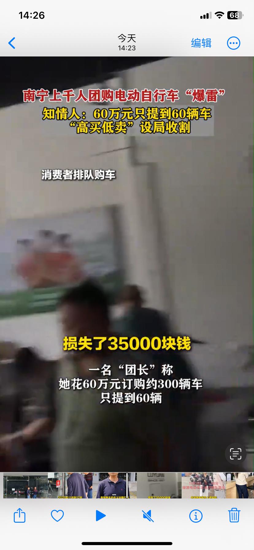 南宁上千人团购电车爆雷!60万只提60辆,高买低卖设局收割 比市场价便宜近千元的品牌电动车,社区团购火爆开抢,上千南宁人争相下单,如今却集体傻眼:钱交了、车没了、门店关门、负责人失联,一场精心策划的骗局彻底爆雷。 涉事商家以绿源电动车为诱饵,打着库存车、已上牌的旗号,用团长分销模式疯狂吸金。一名团长投入60万元订购300辆车,最终仅提车60辆,血本无归。受害者遍布全城,从普通市民到团购代理,少则损失数千元,多则几十万,涉案金额高达数百万元。 骗局套路堪称精准收割:抓住旧国标车禁售节点,以“高买低卖”制造低价假象,用前期少量交付博取信任,靠滚动资金池维持运营,最终资金链断裂跑路。更蹊跷的是,关键股东突然失联,甚至传出“去世”消息,让维权难上加难。 目前,南宁警方已以涉嫌合同诈骗立案侦查,大批受害者正整理证据报案。看似捡漏的福利,实则是挖好的陷阱。低价团购、大额预付、长期等待,三大信号叠加,背后往往藏着骗局。 天上不会掉馅饼,贪小便宜往往吃大亏。这场电车团购爆雷,再次给所有人敲响警钟。