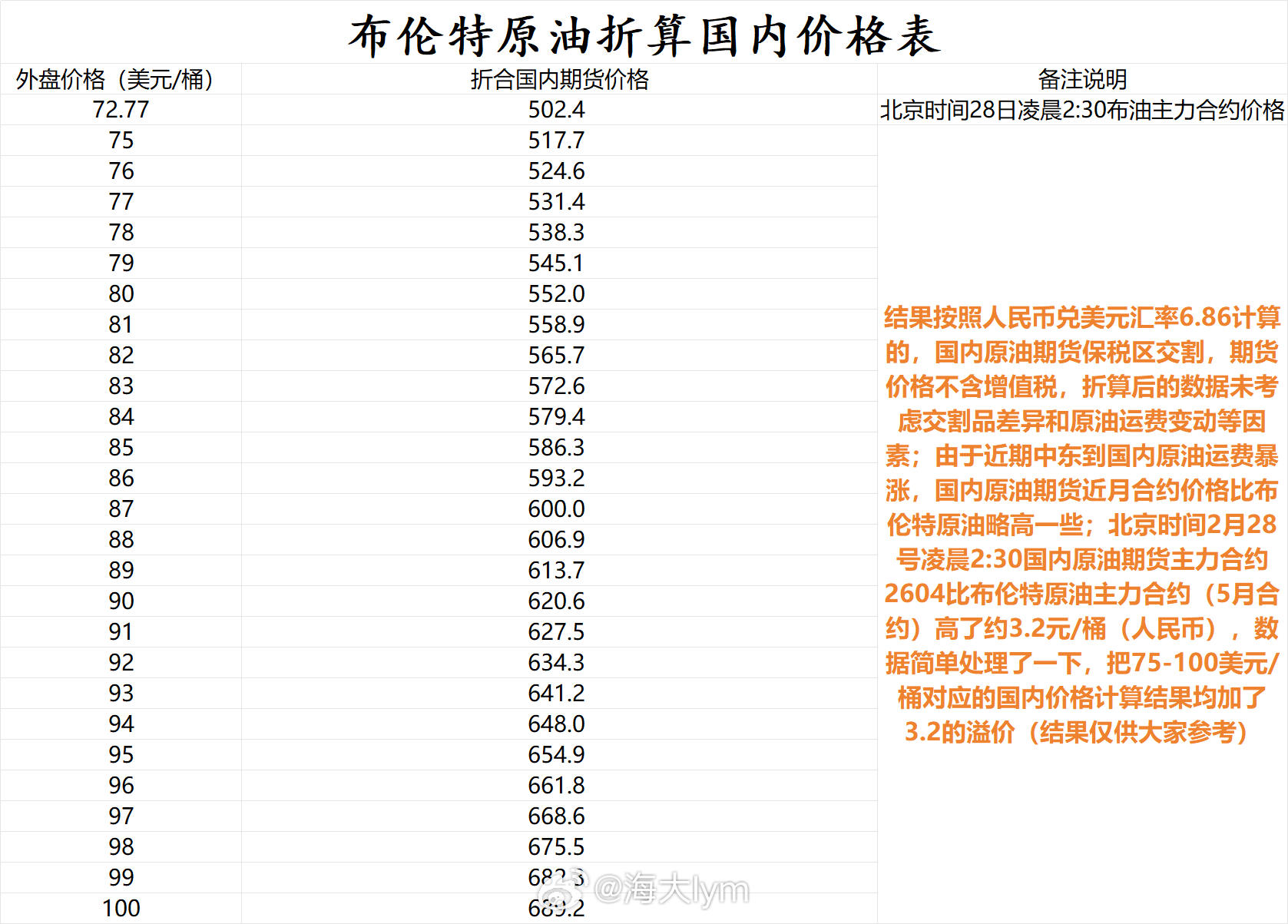 备注说明:附图的结果按照人民币兑美元汇率6.86计算的,国内原油期货保税区交割,期货价格不含增值税,折算的价格未考虑交割品差异和原油运费变动等因素;由于近期中东到国内原油运费暴涨,国内原油期货近月合约价格比布伦特原油略高一些;北京时间2月28号凌晨2:30国内原油期货主力合约2604比布伦特原油主力合约(5月合约)高了约3.2元/桶(人民币),数据简单处理了一下,把75-100美元/桶对应的国内价格计算结果均加了3.2的溢价(结果仅供大家参考)原油期货