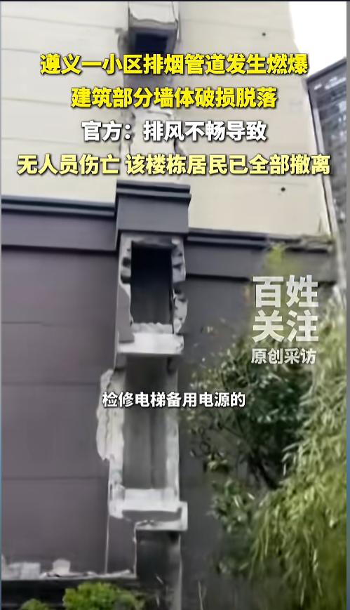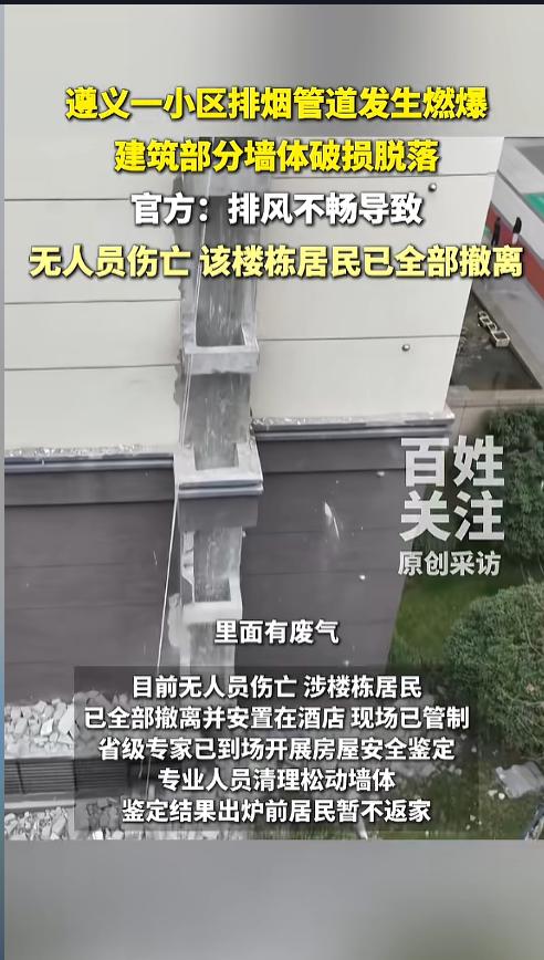 “实在太吓人了!”2月27日,贵州遵义,一小区高层住宅楼外墙,突然发生大面积脱落,现场还伴有爆炸声。周围群众赶紧出来查看,发现该住宅楼附近,散落了大量水泥砖块,墙体破裂从一楼一直延伸到十楼。网友:这楼以后还能住么? 据媒体报道,事发当日,该小区正在维修电梯的备用电源,突然间,一栋住宅楼外墙突然破裂,水泥砖块散落了一地,现场一片狼藉。有人还听到了响声,像是什么东西爆炸了。 事发后,政府多部门立即到场处置,紧急疏散了群众,并将该楼全体住户妥善安置到了宾馆。事故并未造成人员伤亡。 事故调查发现该楼排烟管道发生爆燃,导致废弃井墙体破裂,裂痕从一楼一直延续到十楼,场面令人震惊。原来,当时小区物业人员正在维修电梯的备用发电机,大量的废气积压在排烟管道内,由于通风不畅,发动机启动时导致了爆燃。 调查发现,该楼室内结构暂时没有受损,当地已经联系省级专家来进行房屋安全鉴定,鉴定结果出来之前,该楼居民不会返回家中。 网友看后表示,这种检修难道不应该先做好相关应急准备么?既然是电梯备用电源,不可能是第一次检查维修吧,怎么还能发生这么大的事。还好没有造成人员伤亡! 信息来源:《遵义一小区排烟管道发生燃爆,官方:排风不畅导致,无人员伤亡。》百姓关注