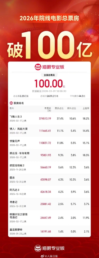 直播吧3月1日讯 据网络平台数据,截至3月1日18时58分,2026年年度总票房(含预售)突破100亿!《飞驰人生3》《镖人:风起大漠》《惊蛰无声》暂列年度票房榜前三位。