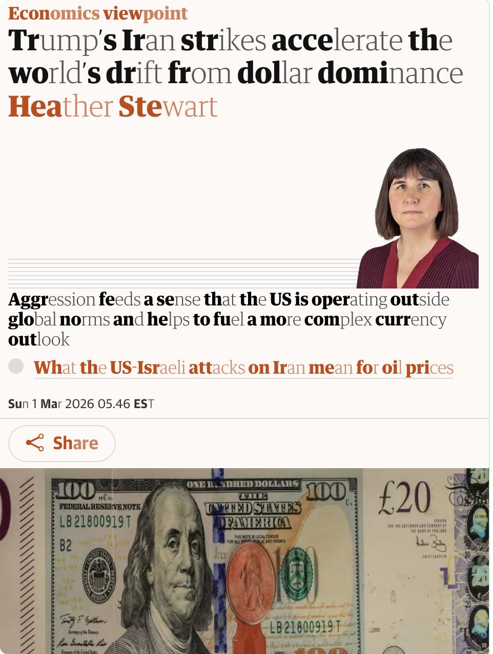 英媒:特朗普对伊朗的军事打击("史诗愤怒行动")加剧了国际社会对美国无视国际法和全球规范的印象,正加速世界摆脱美元主导地位的渐进但历史性的转变。尽管美国经济增长强劲、股市飙升,但贸易加权美元过去一年仍贬值7%。 全球央行外汇储备中美元占比已从2001年的71%降至去年四季度的57%。文章指出,美国日益将金融主导地位用作地缘政治武器("武器化相互依存"),促使各国寻求替代方案。金砖国家正推动建立绕过美国的金融联系,欧洲央行也在强化流动性安排。 研究还显示,美国国债的"便利性收益"正在下降,鉴于美国债务预计五年内将达GDP的130%,美元霸权减弱最终将让美国付出沉重代价。