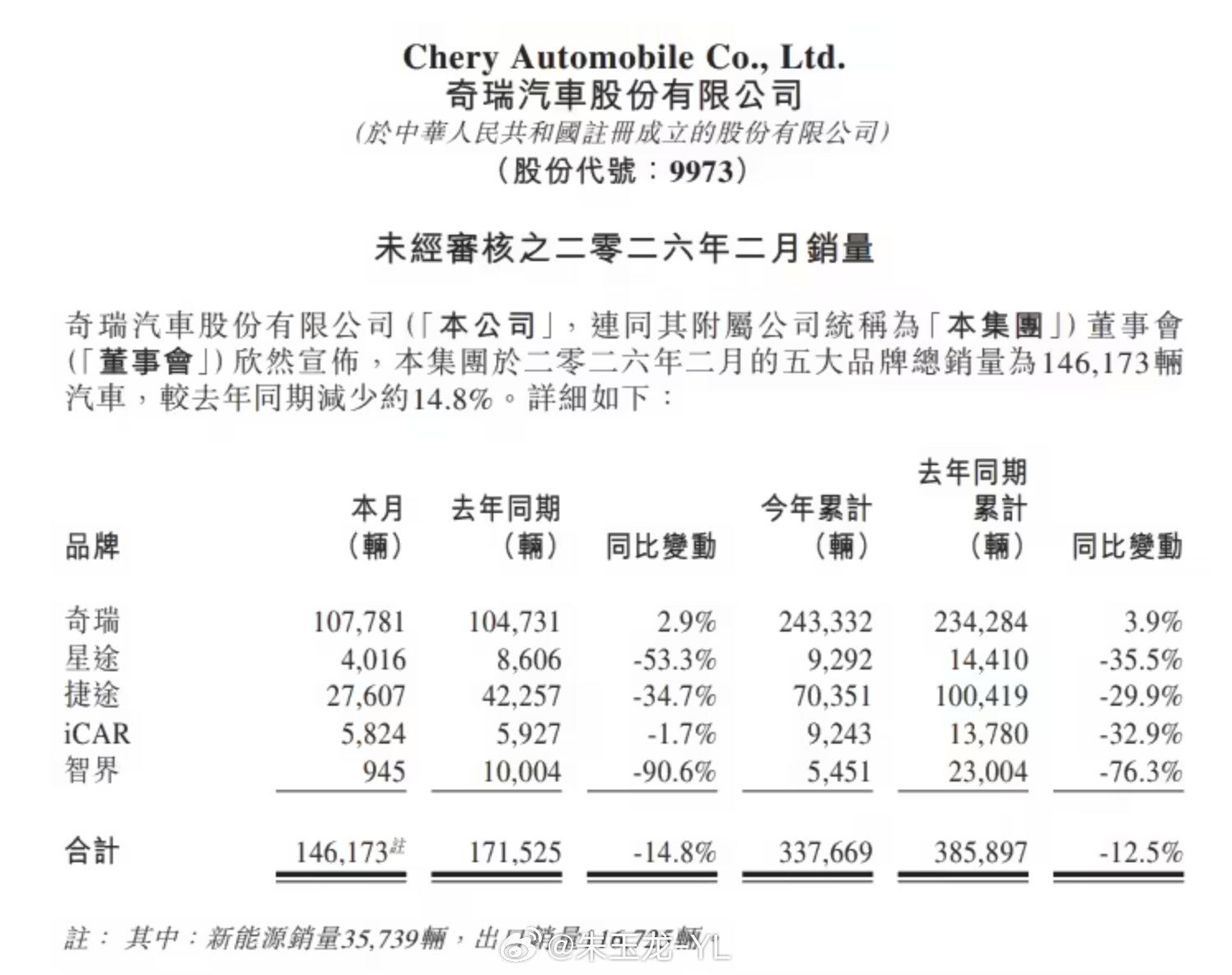 吉利:月销20.6万台,国内最多总销量20.6万台,同比增长约1%,国内销量14.2万台。旗下各品牌集体开花:吉利品牌15.5万台、银河7.3万台、领克2.7万台、极氪2.4万台(同比暴增70%)。更值得关注的是,纯电6.8万台、插混5万台(同比+89%)