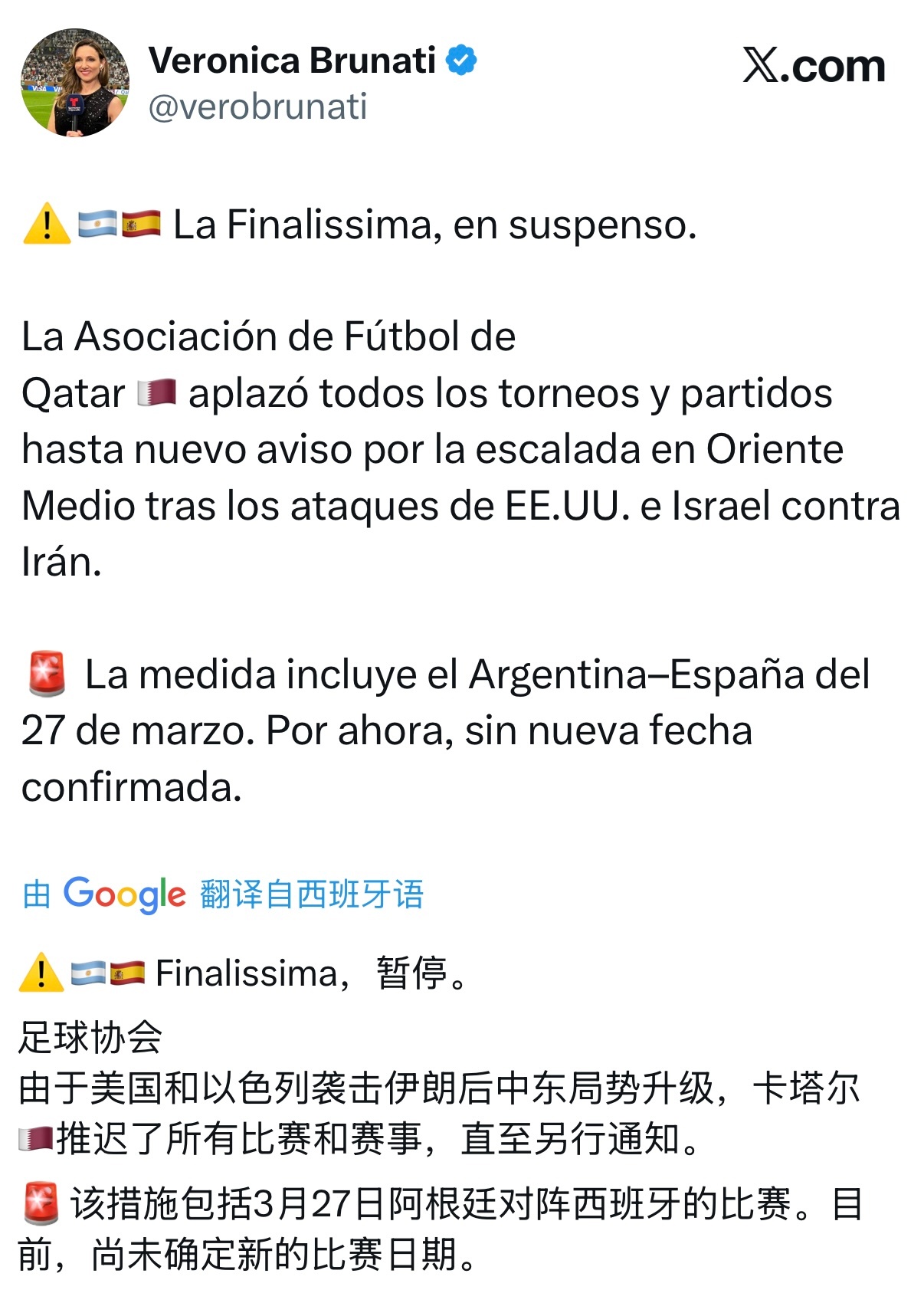 阿根廷女记者维罗妮卡·布鲁纳蒂陈(Veronica Brunati)|欧美杯决赛原定于当地时间3月27日举行,但因故暂停,目前尚未公布新的比赛日期。 伊朗前总统内贾德遇袭身亡 伊朗袭击27个美军基地