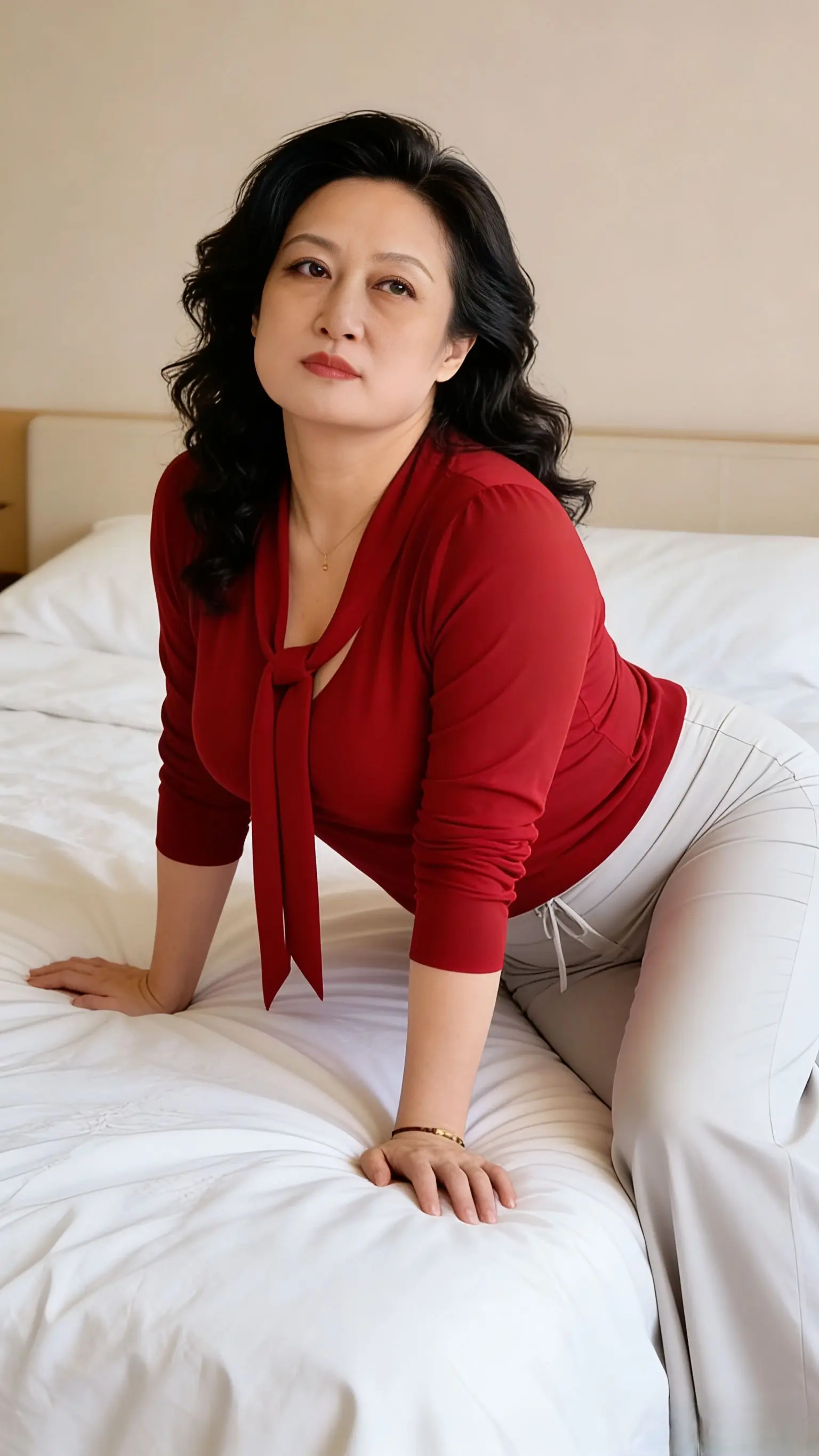 分享生活美好时刻大美女,紧身纯白色衬衫,同色紧身阔腿裤,同色尖头细跟高跟鞋,中长