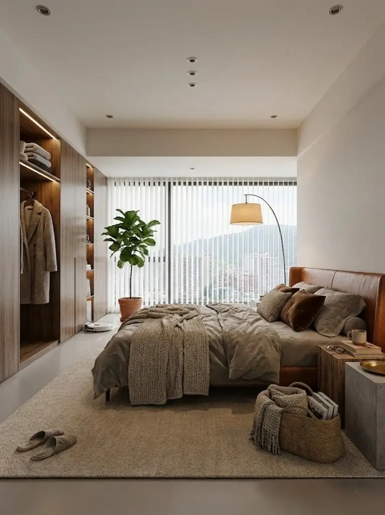 客厅大面积落地窗搭配柔和的百叶帘,让阳光随着成都的四季流转。清晨或黄昏,斑驳的光影洒在焦糖色皮质沙发上,居家氛围感瞬间拉满。📸
