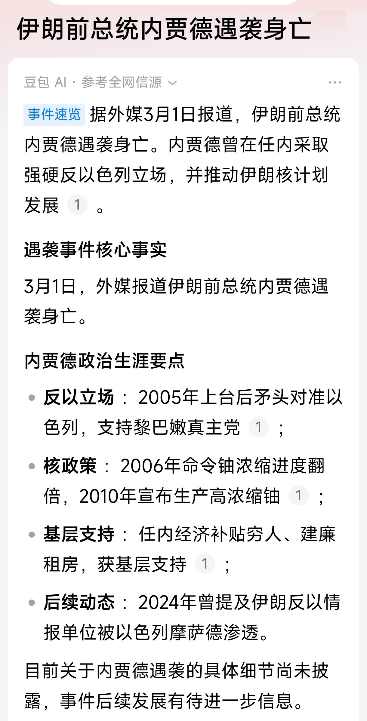 “当大官是有生命危险”,古人不诚欺我! 这次伊朗的阿里·哈梅内伊、穆萨维、穆罕默德·帕克普尔、阿齐兹·纳西尔扎德、阿里·沙姆哈尼、穆罕默德·希拉齐、萨利赫·阿萨迪、穆罕默德·达雷巴吉、阿克巴尔·易卜拉欣扎德、古拉姆雷扎·雷扎伊安、巴赫拉姆·侯赛尼·莫塔勒克、哈桑阿里·塔吉克等等不少于40名高官遇难,就连退休的前总统内贾德也没有善终,这就是残酷的真相! 按道理来说,伊朗综合实力强大,中东的大国,但是依然没有抵挡住现代信息战争的斩首轰炸,尤其和美国联手以色列的精准轰炸的军事力量相差悬殊,有人说只要不挑事不找事就没有事,事实情况不是这样的,“强者为尊”的时代,找一个理由就“轰炸”,“斩首”,轰炸伊朗高官后,给更多小国家带来的是威胁和害怕,想要活下去就得顺从,还要保护好国家政要安全,与当时“不结盟运动”,“中立”时代完全不一致,越是全球经济下滑发生贫瘠,狼豺虎豹就越多,生存需求就会提升“居安思危”! 这个世界小国家会变的自保起来,武装起来,报团起来,因为都要好好的活着!