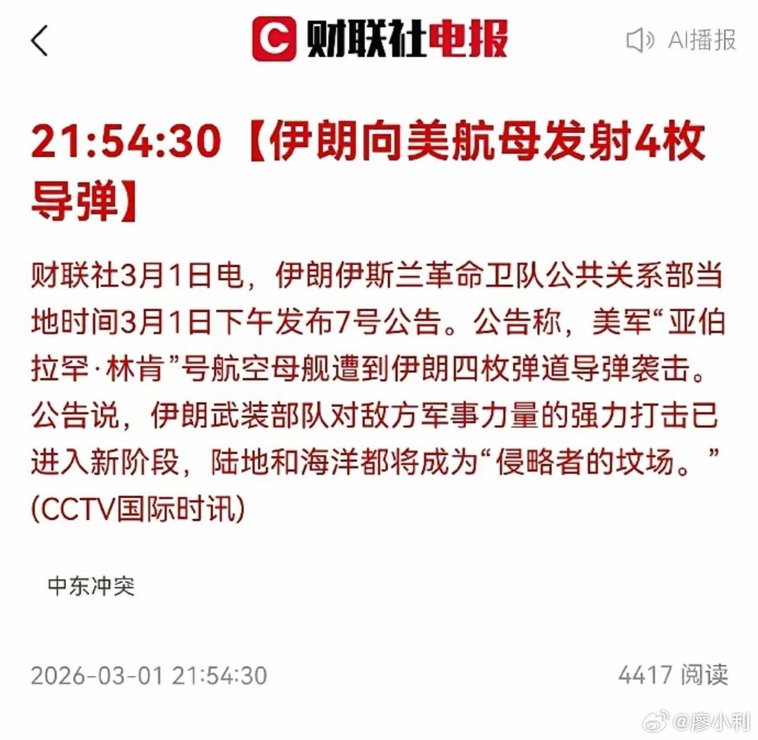 伊朗向美军林肯号航母发射导弹如果这个消息是真的,这对全世界来说,是一个可以载入史册的事件。因为这是首次有国家,利用多枚弹道导弹直接打击美国航母。 热点观点