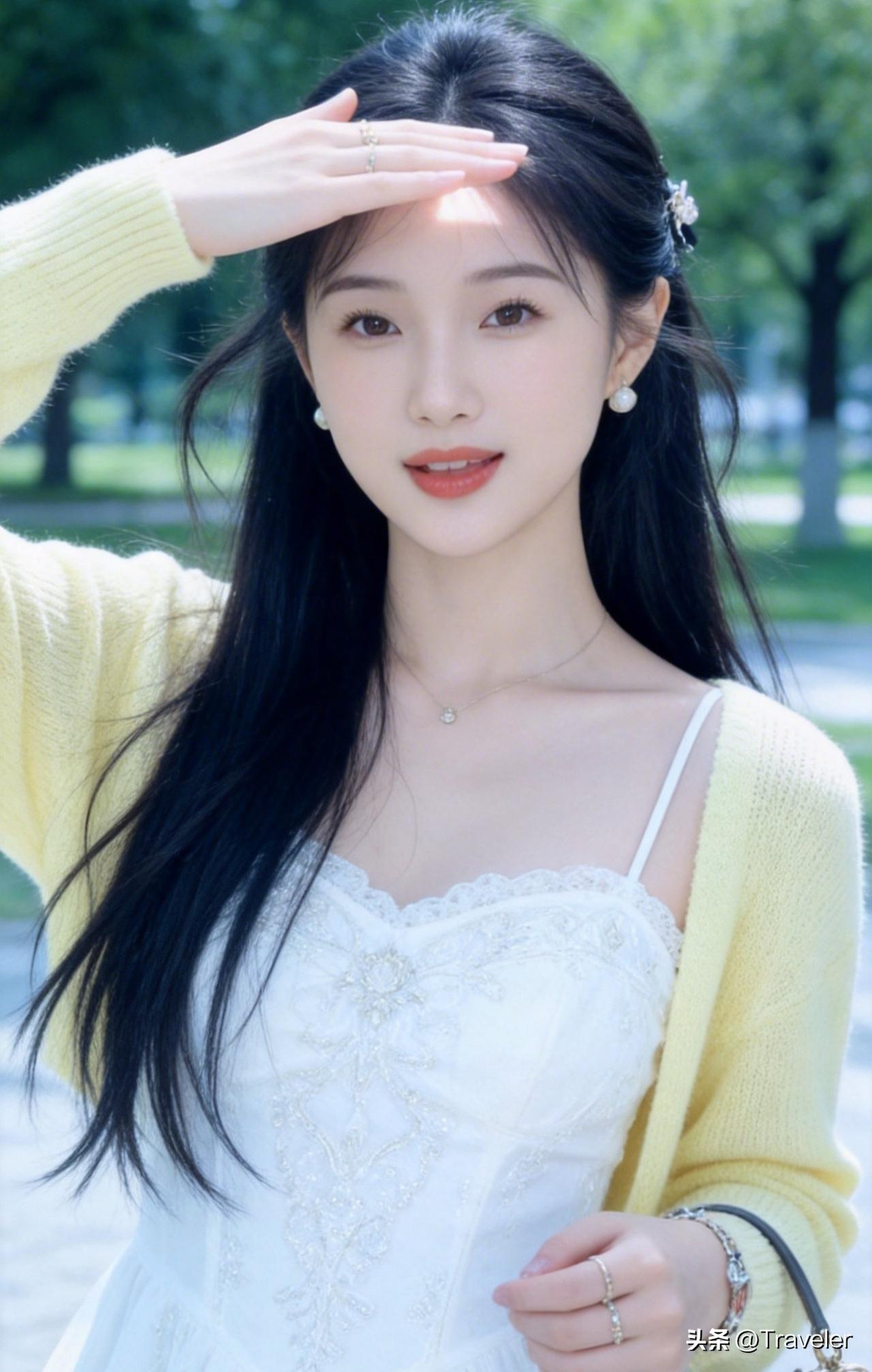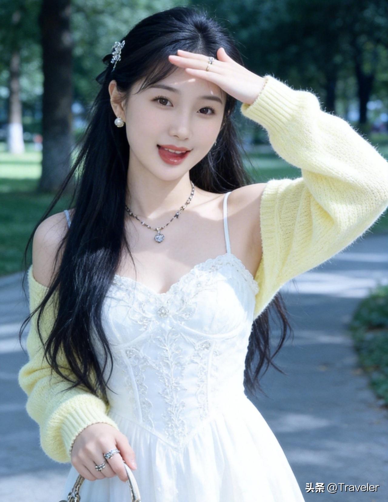 阳光明媚的午后,少女在公园里微笑着挥手。
