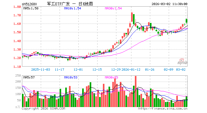 3月2日,截止午间收盘,军工ETF广发(512680)涨1.26%,报1.609元,成交额1.36亿元。军工ETF广发(512680)重仓股方面,中国船舶截止午盘涨0.53%,光启技术涨1.25%,航天电子涨3.99%,中国卫星涨6.52%,航发动力涨6.39%,中航沈飞涨3.74%,中航光电涨1.69%,航天发展涨2.31%,菲利华跌3.51%,睿创微纳涨1.60%。