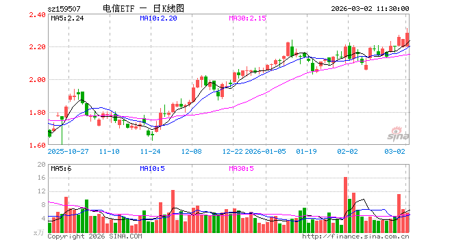 3月2日,截止午间收盘,通信ETF广发(159507)涨1.78%,报2.283元,成交额1327.55万元。通信ETF广发(159507)重仓股方面,中际旭创截止午盘涨6.74%,新易盛涨5.16%,中兴通讯跌1.84%,中国移动涨1.43%,中国电信涨1.55%,天孚通信跌5.13%,中国联通涨0.00%,信维通信涨1.50%,中天科技涨4.91%,亨通光电涨6.36%。