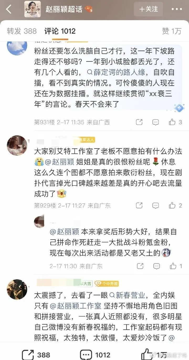 网上刷到赵丽颖粉丝在那儿念叨,说她这两年没什么事业心。确实,这两年她的剧不怎么景气,代言也少了,口碑也不如从前。可赵丽颖自己好像不怎么在意这些。过年那会儿,别的85后小花都发微博给粉丝送祝福了。就连还没完全解封的baby,赋闲挺久的刘亦菲,在剧组忙着拍戏的刘诗诗,回家过年的唐嫣……全都露面了。就赵丽颖,全平台一点儿动静没有,粉丝在底下喊破喉咙,她也没回一句。
