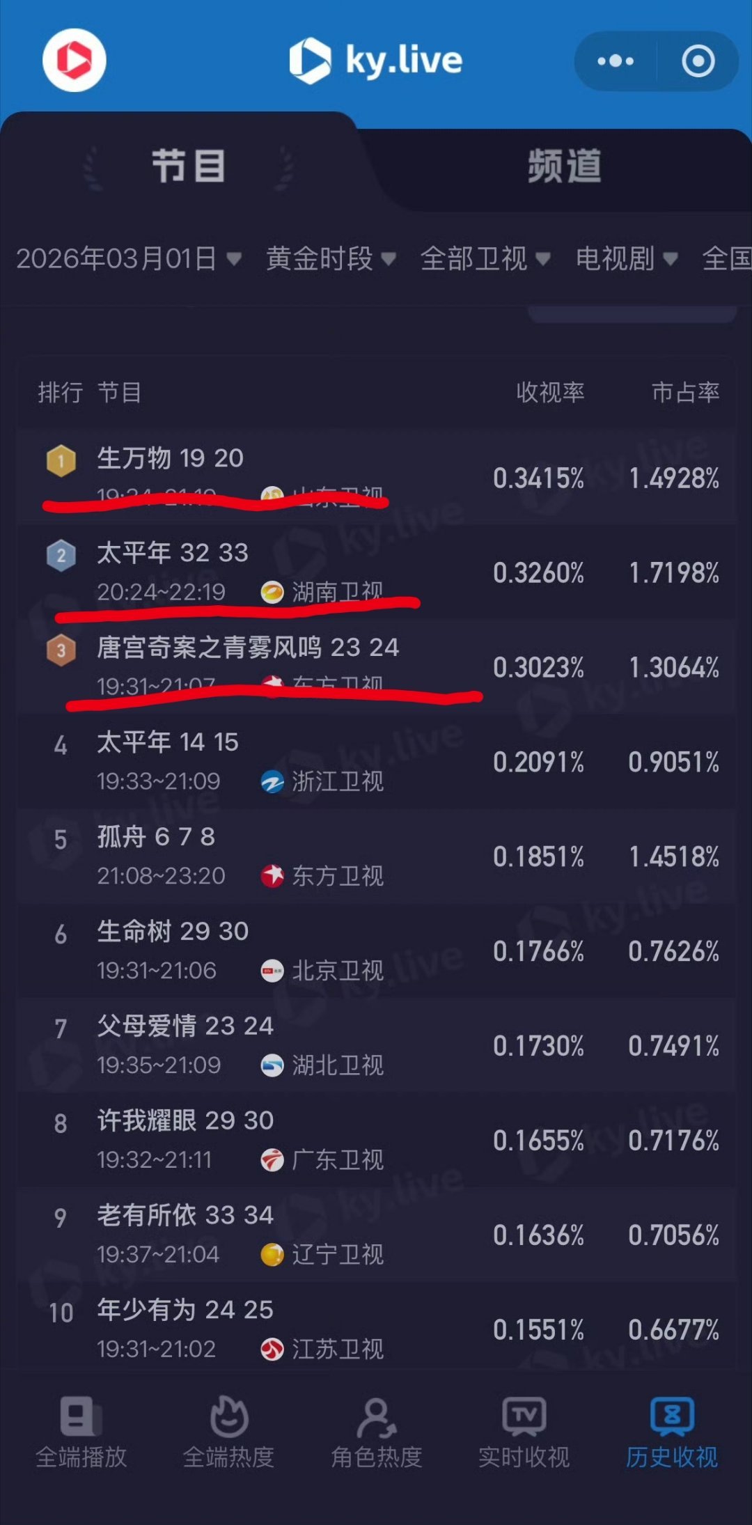 3月1日,黄金时段卫视剧集数据排名前三:❶杨幂,欧豪《生万物》,山东卫视。❷白宇,周雨彤《太平年》 ,湖南卫视。❸白鹿,王星越《唐宫奇案之青雾风鸣》,东方卫视。仿佛被说氵的剧都播的挺好的。