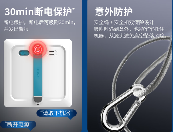第三、擦窗机器人哪个牌子好啊?高层必看“安全防坠”,别图便宜!一定要选带加粗安全绳+断电续航的,哪怕突然断电也能稳稳吸在玻璃上,既安全又不用慌慌张张救机器,高层住户用着也能放心。