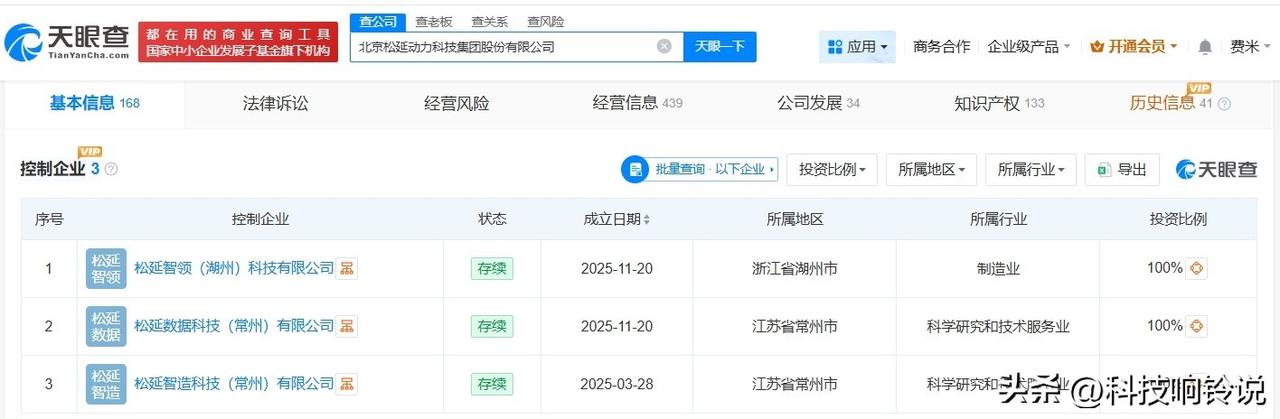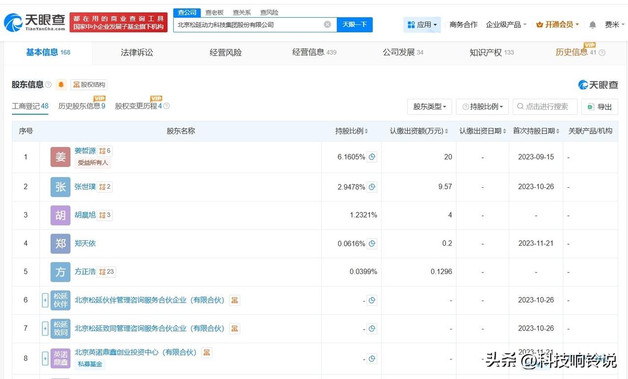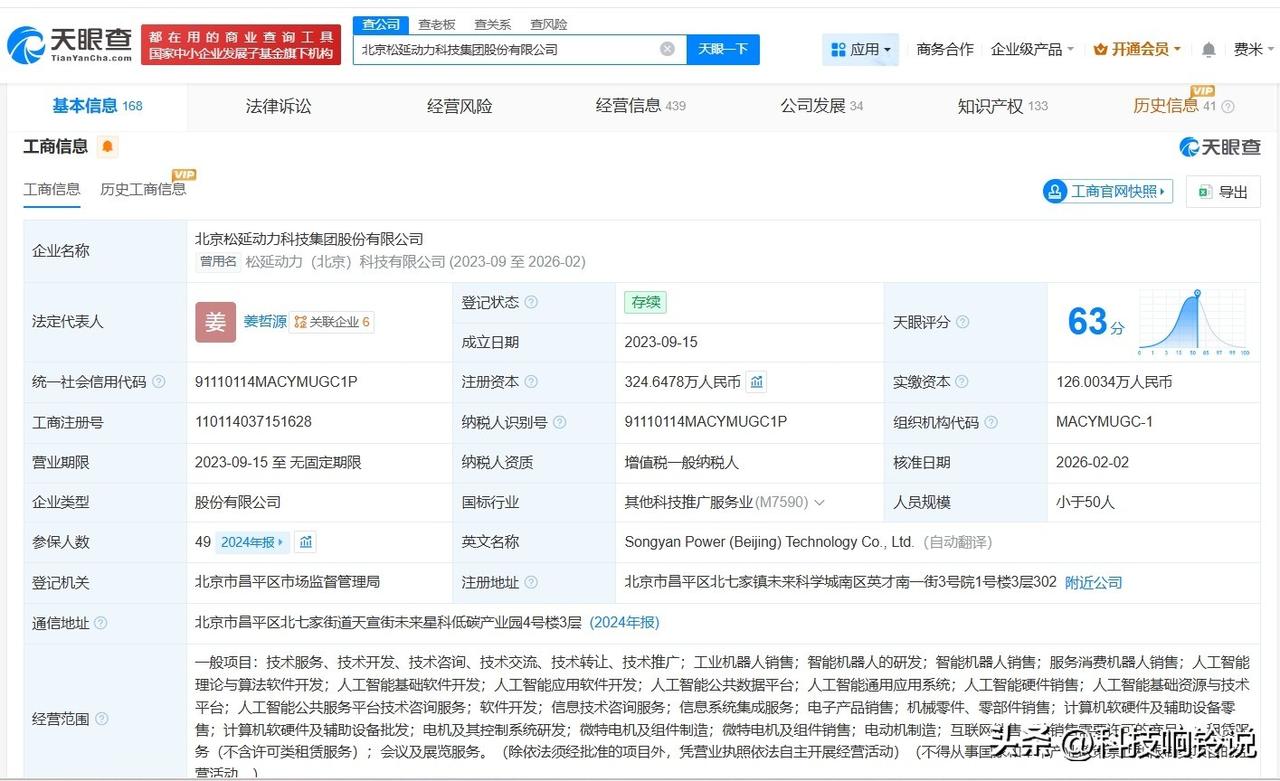 【松延动力近期变更为股份有限公司 松延动力去年多次增资 松延动力去年成立多家新公司】 据媒体报道,3月2日,松延动力宣布完成B轮融资。本轮融资由宁德时代系产业投资平台晨道资本领投,B轮融资规模累计近10亿元。目前,松延动力已累计完成了9轮融资。 天眼查工商信息显示,北京松延动力科技集团股份有限公司成立于2023年9月,法定代表人为姜哲源,注册资本约325万人民币,经营范围包括工业机器人销售、智能机器人的研发、智能机器人销售等。股东信息显示,该公司由姜哲源、北京松延伙伴管理咨询服务合伙企业(有限合伙)、北京松延致同管理咨询服务合伙企业(有限合伙)等共同持股。控制企业信息显示,去年,该公司成立了松延智领(湖州)科技有限公司、松延数据科技(常州)有限公司、松延智造科技(常州)有限公司。变更记录信息显示,今年2月,该公司企业名称由松延动力(北京)科技有限公司变更为北京松延动力科技集团股份有限公司,此外,该公司去年多次发生增资。 天眼查信息: