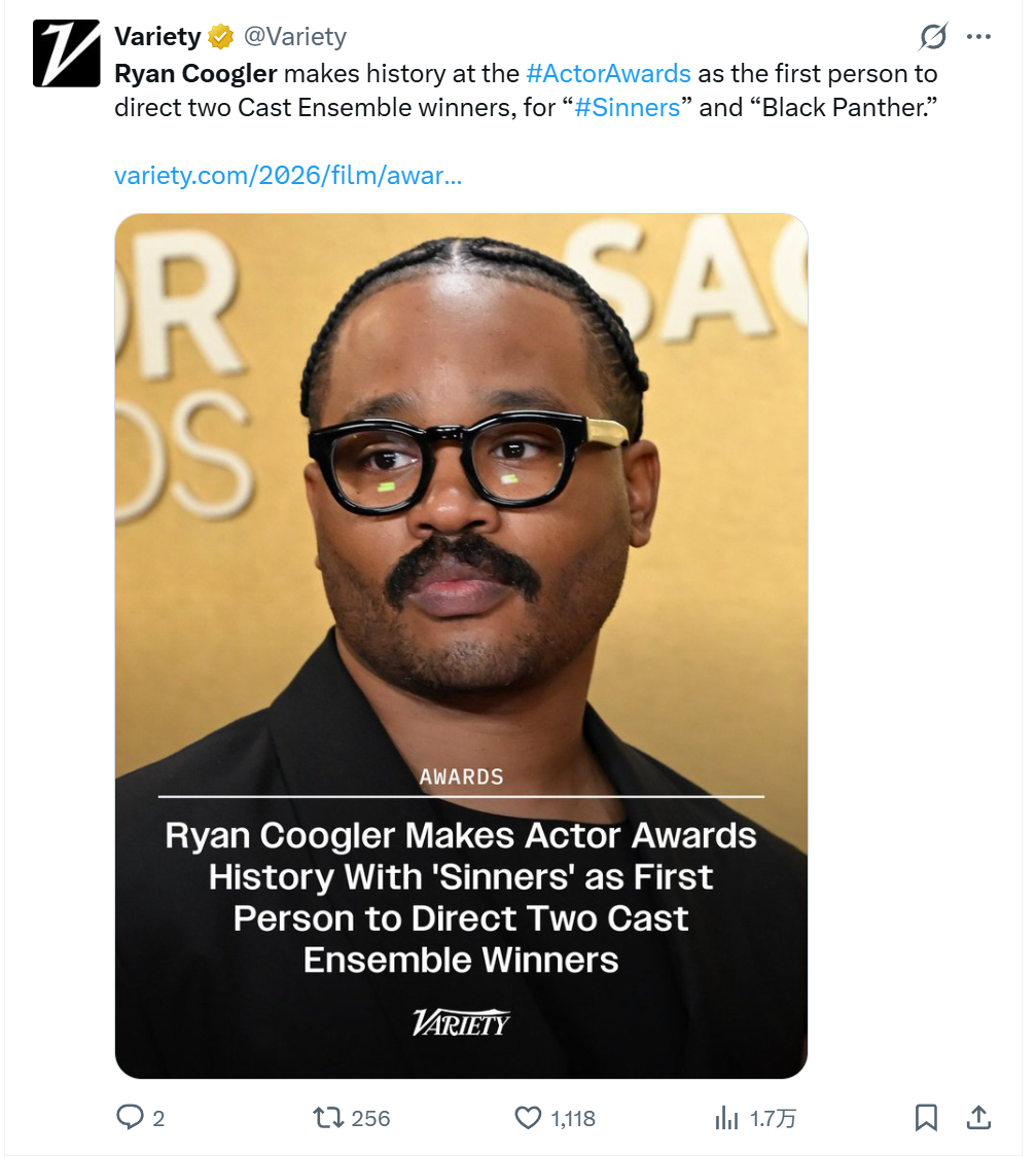 TNABO 瑞恩·库格勒成为演员工会史上首位两度斩获群戏奖的导演,上次是《黑豹》,这次是《罪人们》