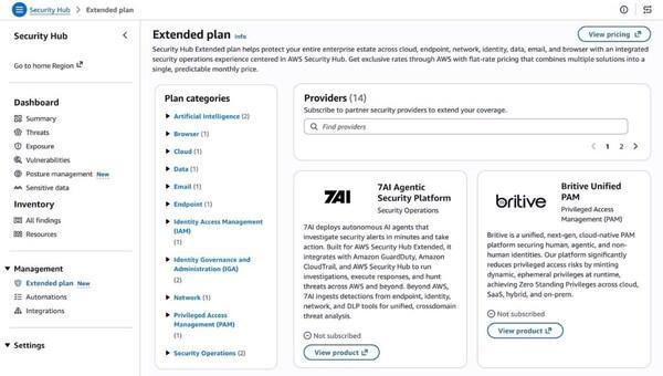 北京2026年3月2日/美通社/--亚马逊云科技宣布推出AmazonSecurityHub拓展方案。作为AmazonSecurityHub的一项新计划,它简化了全栈企业安全解决方案的采购、部署与集成流程。该方案覆盖范围广泛,横跨终端、身份、电子邮件、网络、数据、浏览器、云、AI及安全运营等多个领域。借助拓展计划,客户可以将安全防护范围扩展至亚马逊云科技环境之外,通过包括7AI、Britive、CrowdStrike、Cyera、Island、Noma、Okta、Oligo、Opti、Proofpoint、SailPoint、Splunk、Upwind及Zscaler等精选合作伙伴解决方案来保护企业资产。