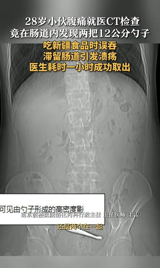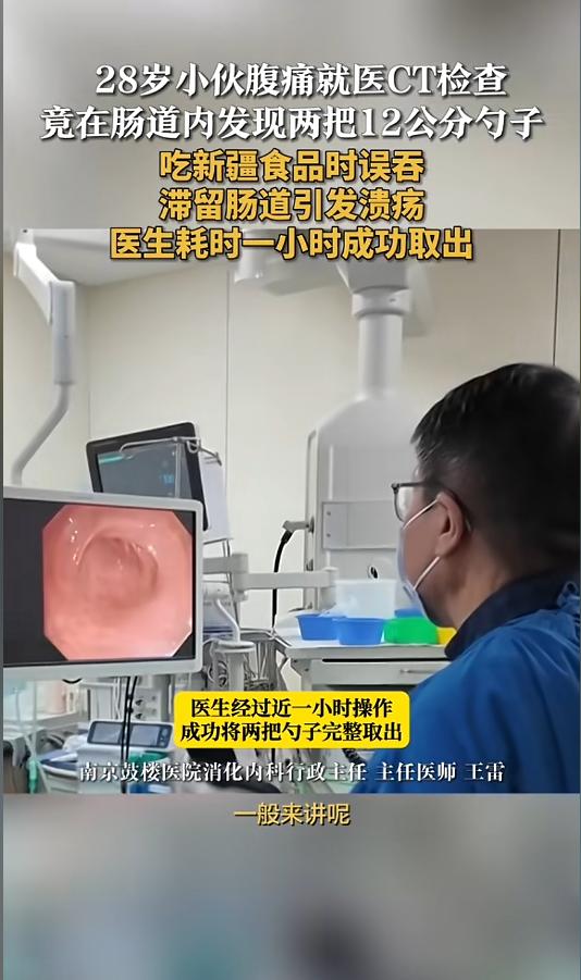 “万万没想到!”近日,江苏南京,一男子因误吞了一把勺子,腹痛难耐到医院就诊。医生赶紧给做了CT检查,发现勺子已经卡在了回肠末端,而且是两把,随时有肠穿孔的风险。经过一个小时的紧张手术,勺子终于被取出。网友:怎么吞下去的呢? 日常生活中,难免会有些误食异物的情况,像什么鱼刺、枣核,大多数人都被卡住过。可有些异物就不那么常见了,就比如说,勺子。 据媒体3月2日报道,事发当日,该男子在吃新疆食品时,误把里面的勺子吞了下去,腹痛难忍,急忙去往医院就医。男子当时说,自己就吞了一把。 医生给男子安排了CT检查,确定了勺子的位置。检查发现,勺子大概有12厘米长,已经卡在了回肠末端,而且还是两把。当时的情况非常危险,肠道黏膜已经出现溃疡,随时都有穿孔的可能。 医生给男子安排了紧急手术。两个勺子卡在一起,肠腔内非常的狭窄。而且本身的距离也非常远,手术难度非常高。医生非常小心,经历了一个小时的紧张手术,终于给完整取了出来。 网友看后表示,吃东西时一定要细嚼慢咽,千万别跟猪八戒吃人参果似的。人体的食道、胃肠都很脆弱,这种尖锐的异物一旦吞下,很容易造成穿孔,进而引发感染,十分的危险。 误食异物后,一定要及时取出,24小时内最佳。这个时间段内,感染比较容易控制,一般不会引起严重的并发症。时间一旦拖得久了,风险就会急剧加大,结果难以预料! 信息来源:《28岁小伙腹痛就医CT检查 竟在肠道内发现两把12公分勺子 吃新疆食品时误吞滞留肠道引发溃疡 医生耗时一小时成功取出》荔枝新闻