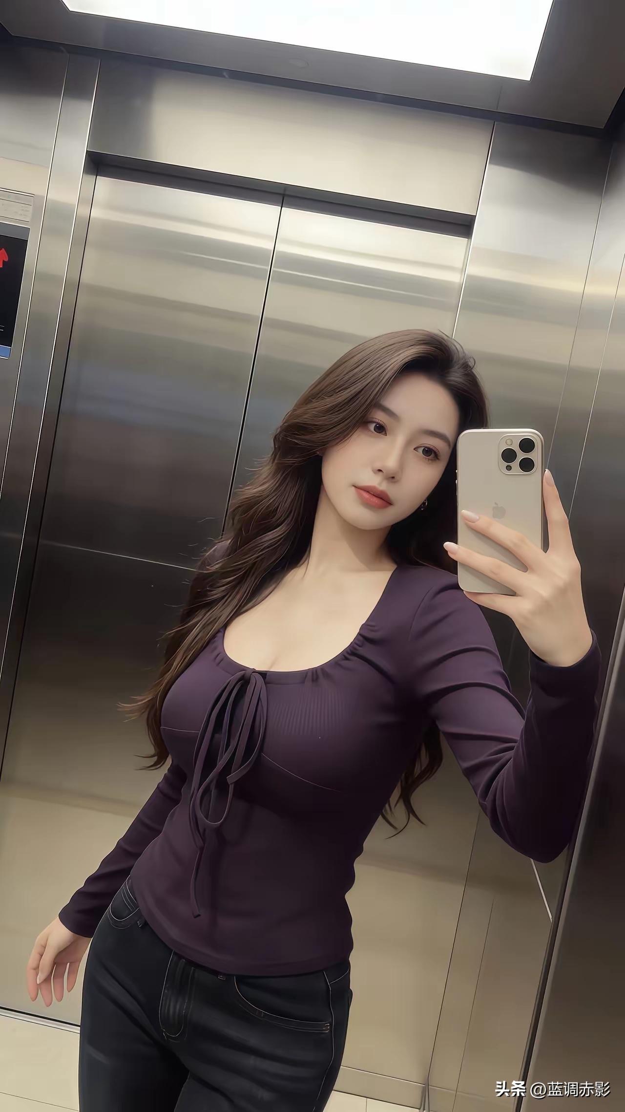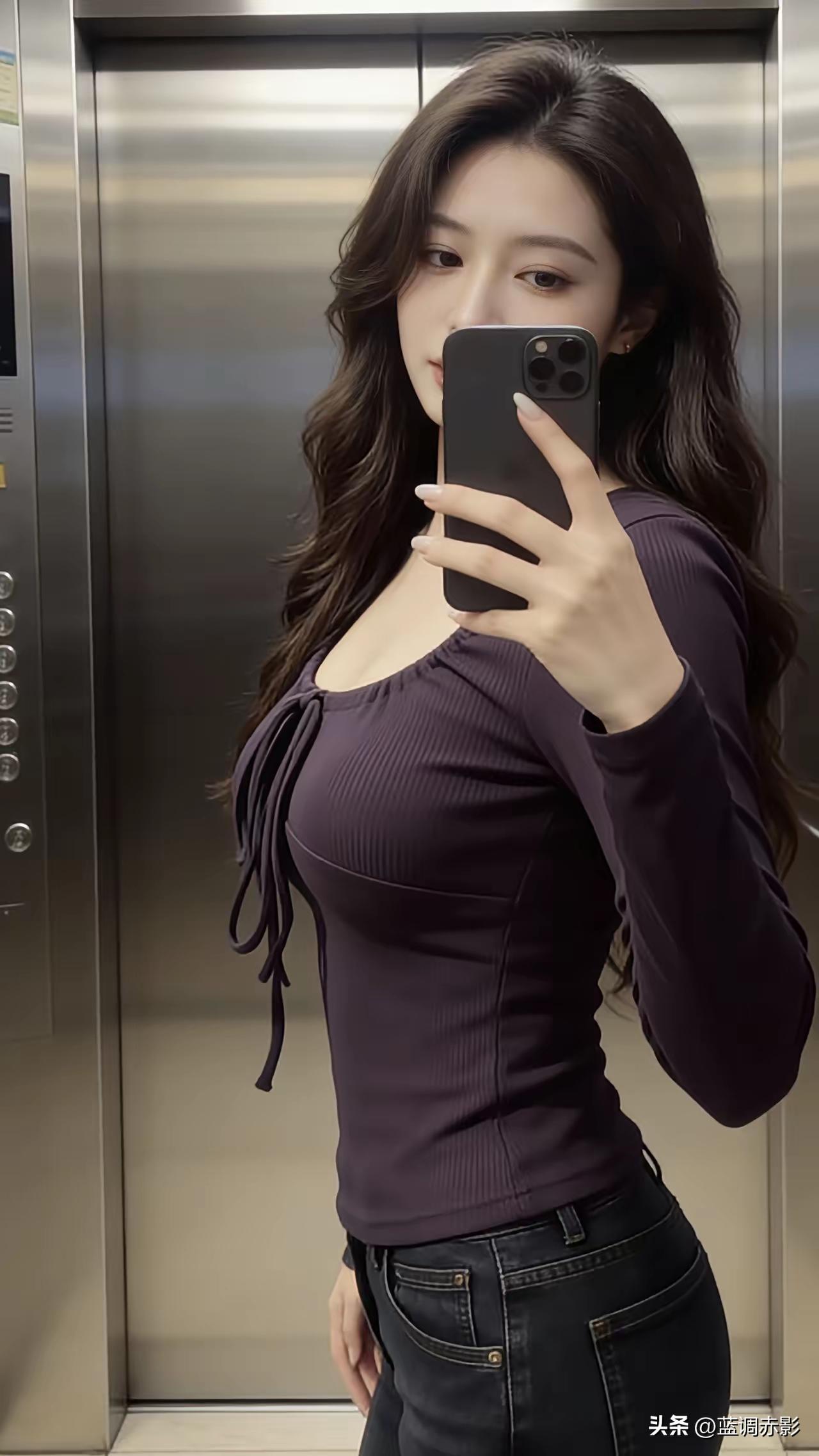 电梯自拍,紫色上衣搭配牛仔裤,时尚又自信!