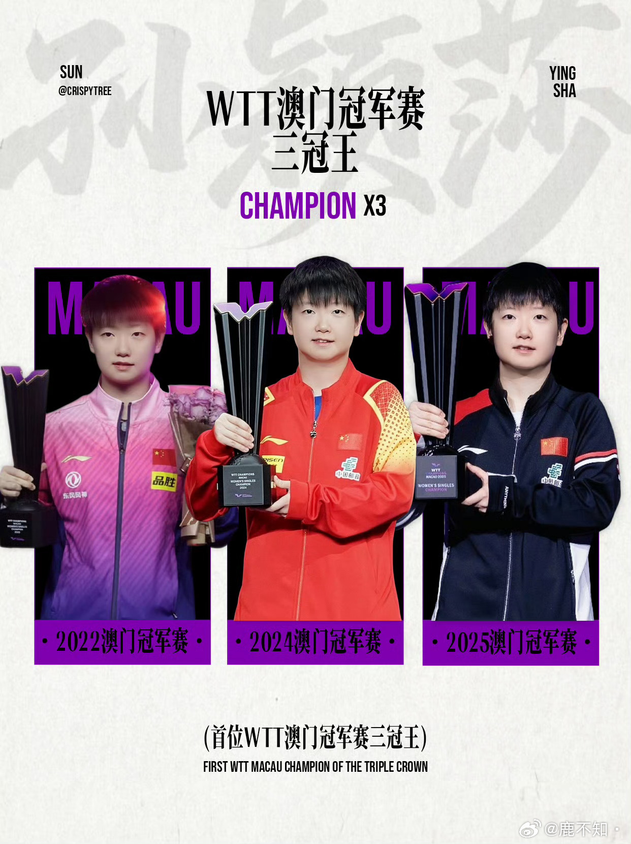 孙颖莎王楚钦领跑WTT冠军榜WTT大满贯赛事首位五冠王孙颖莎🏆WTT新加坡大满贯首位三冠王孙颖莎🏆WTT首位积分破万运动员孙颖莎🏆WTT总决赛首位三冠王孙颖莎🏆WTT冠军赛最多孙颖莎🏆现役最年轻洲际赛金满贯🏆