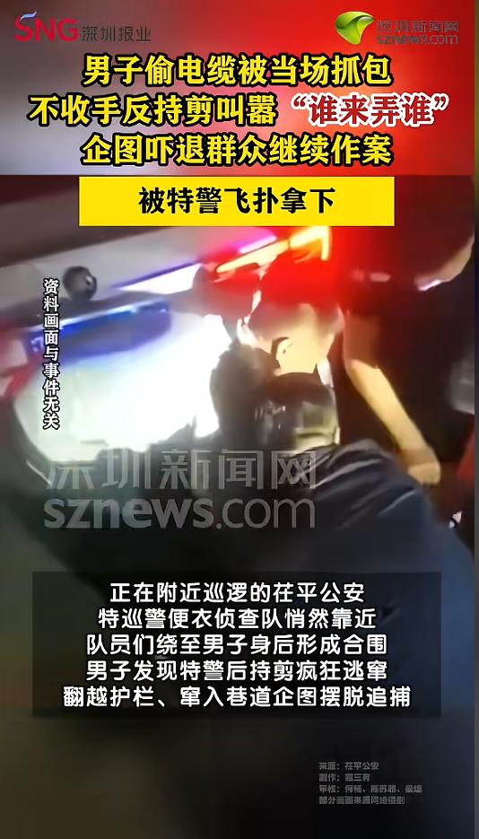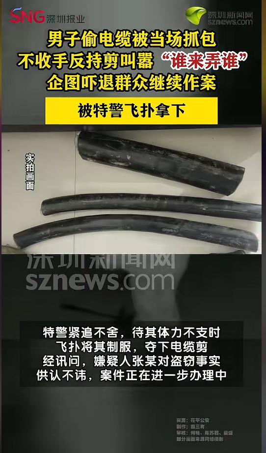 “必须严惩!”近日,山东聊城,一男子在某小区附近,手持专业电缆钳盗窃电缆。被周围群众发现后,该男子不仅不跑,反而出言恐吓,试图吓退群众。附近巡警发现后,立刻上前制止,待其体力不支,将该男子抓获。网友:也不怕把自己电死! 最近一段时间,随着金价银价的大涨,铜价也跟着涨了起来,甚至出现了投资铜条。看着高涨的铜价,有人动起了歪心思。 据媒体3月1日报道,事发当晚,有群众发现在一个小区附近,有一名男子鬼鬼祟祟的,靠近一看,发现他手里拿着专业的电缆钳,正在偷电缆。 群众赶紧上前出声制止,谁知道该男子不仅不收手,竟然拿着电缆钳大吼“别管闲事,谁来我弄谁!”,意图将周围群众吓跑,继续作案。 这时候,周围巡逻的警察听到声音,悄悄地从男子身后绕了上来,给男子形成了一个包围圈。男子发现警察后,一下子就没了刚才的嚣张气势,翻越护栏,撒腿就跑。 警察紧追不舍,在看到男子有些体力不支的时候,一个飞扑将男子制服,夺下了男子手中的电缆钳,随后将男子带回了公安机关。经过审讯,嫌疑人对盗窃事实供认不讳。 网友看后表示,春节期间,什么牛鬼蛇神都冒出来了!还好有警察巡逻,打击了他们的嚣张气焰,维护了社会治安的稳定。 信息来源:《【男子深夜偷剪电缆被抓包持械叫嚣被特警飞扑制服】