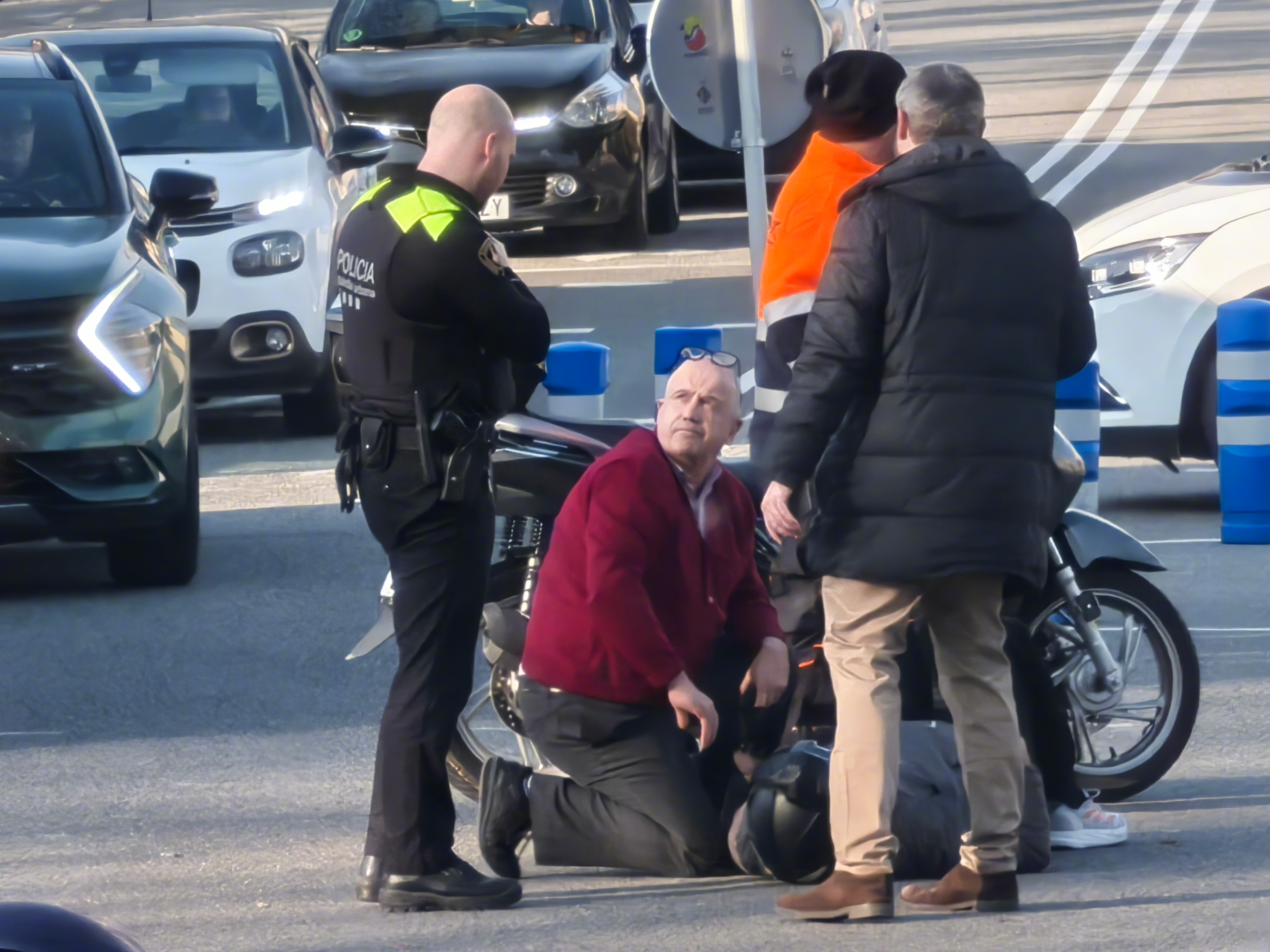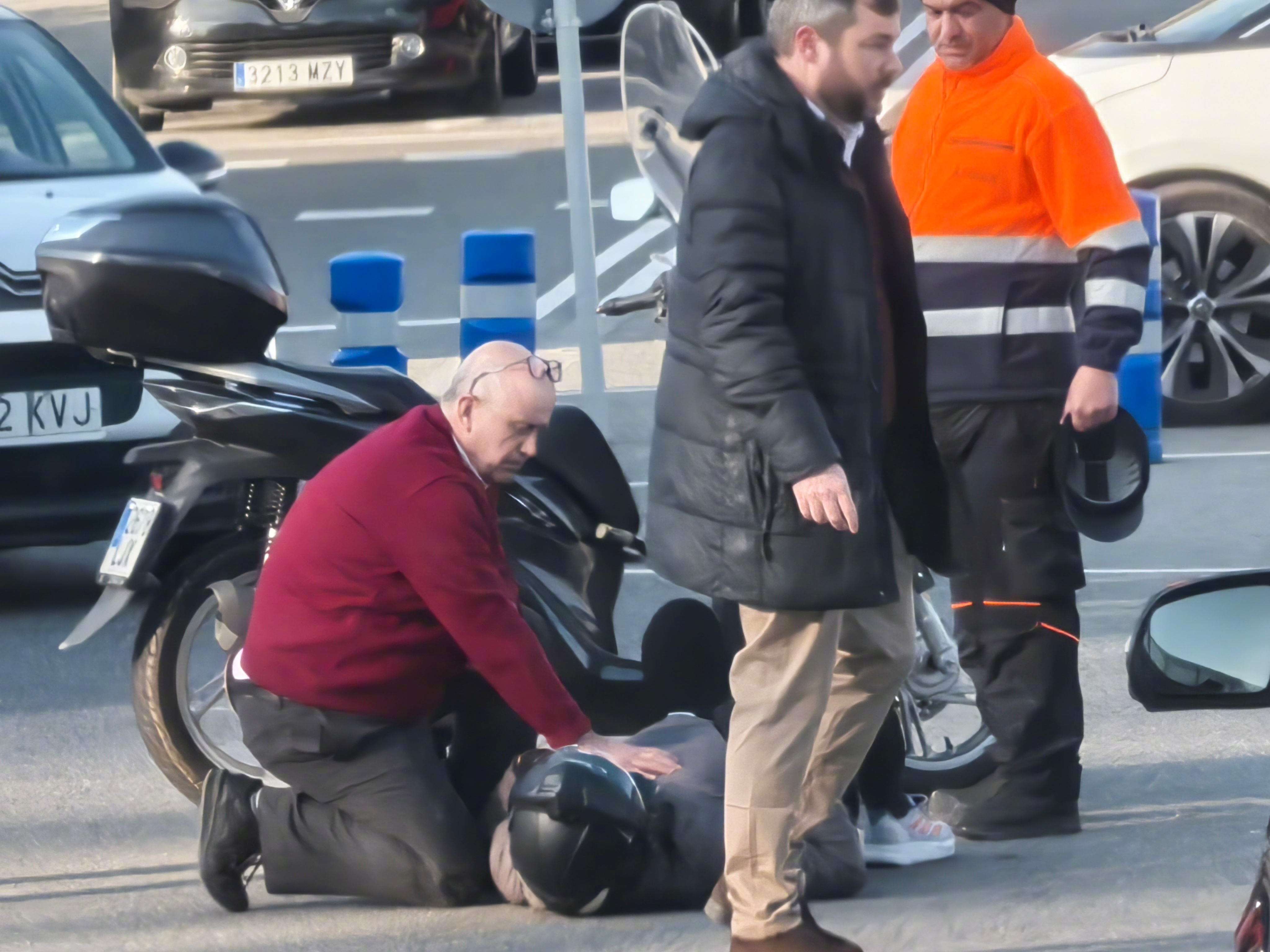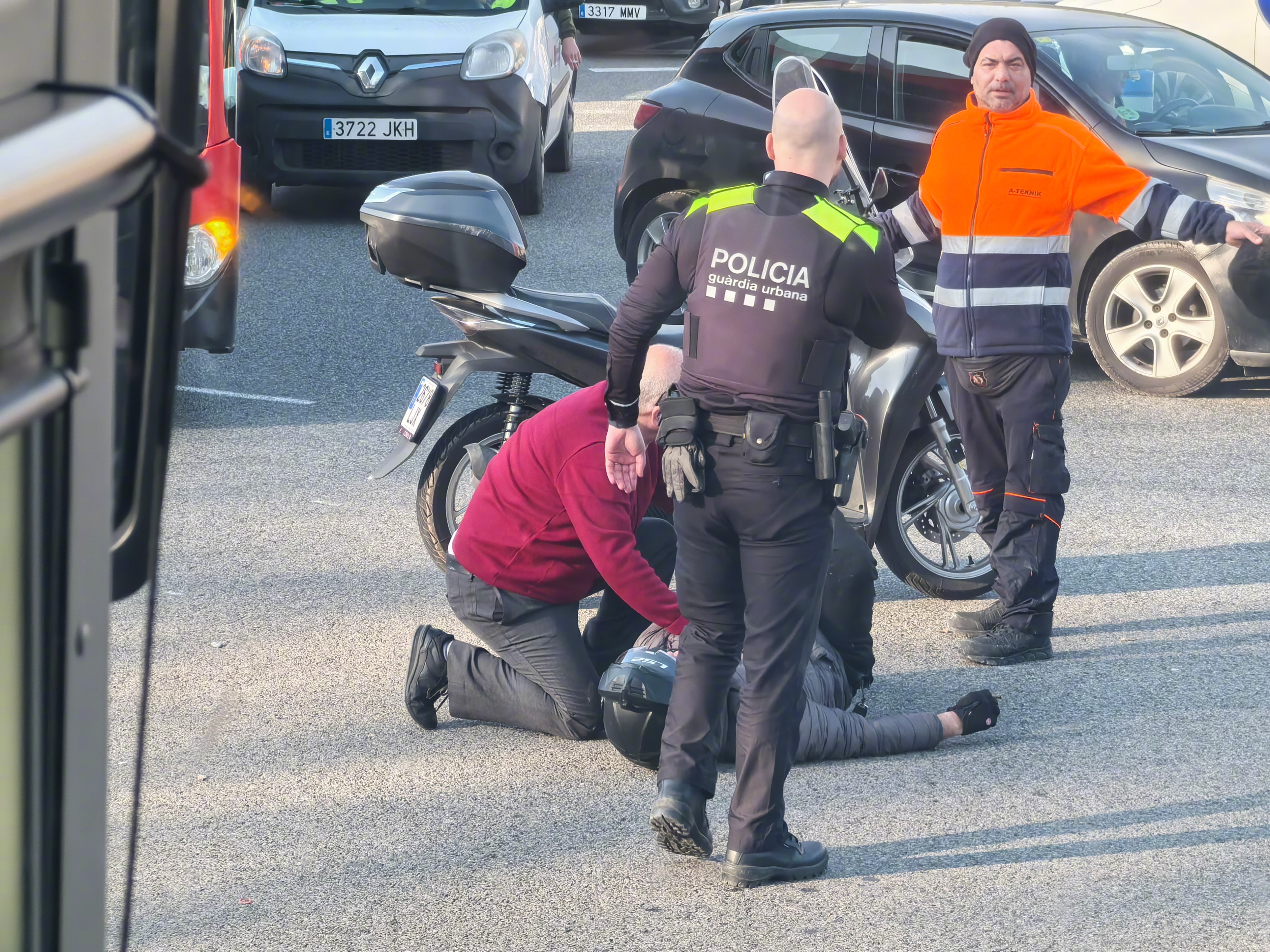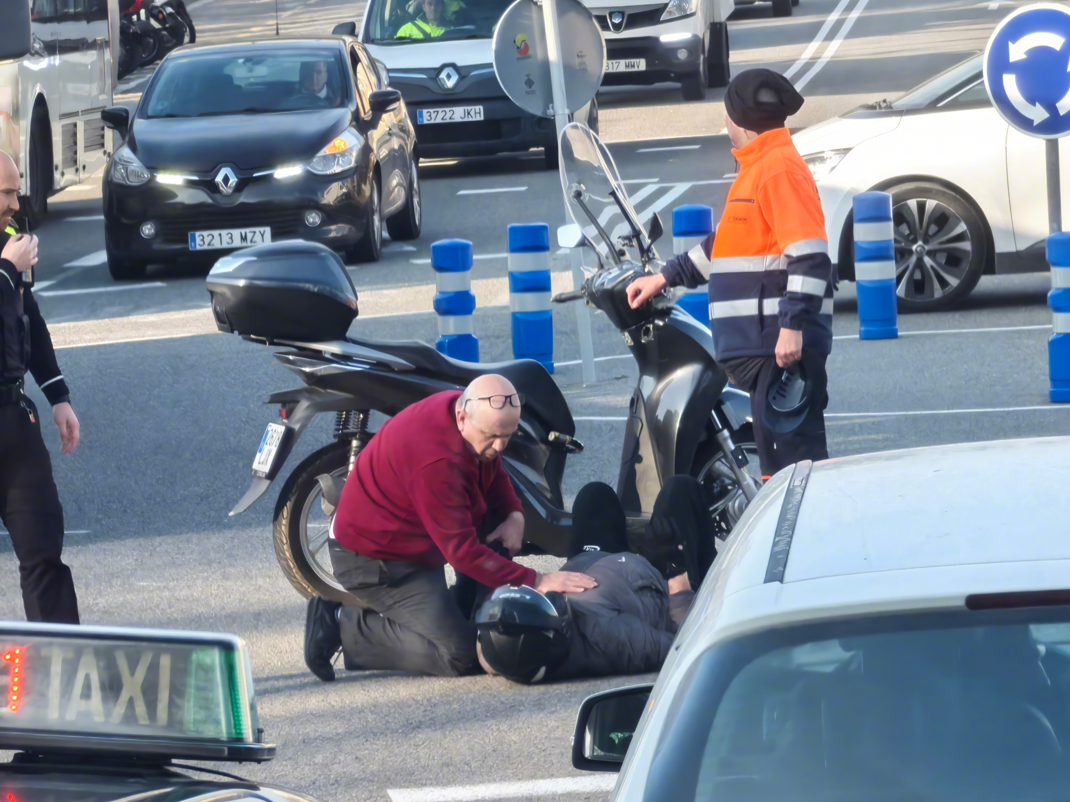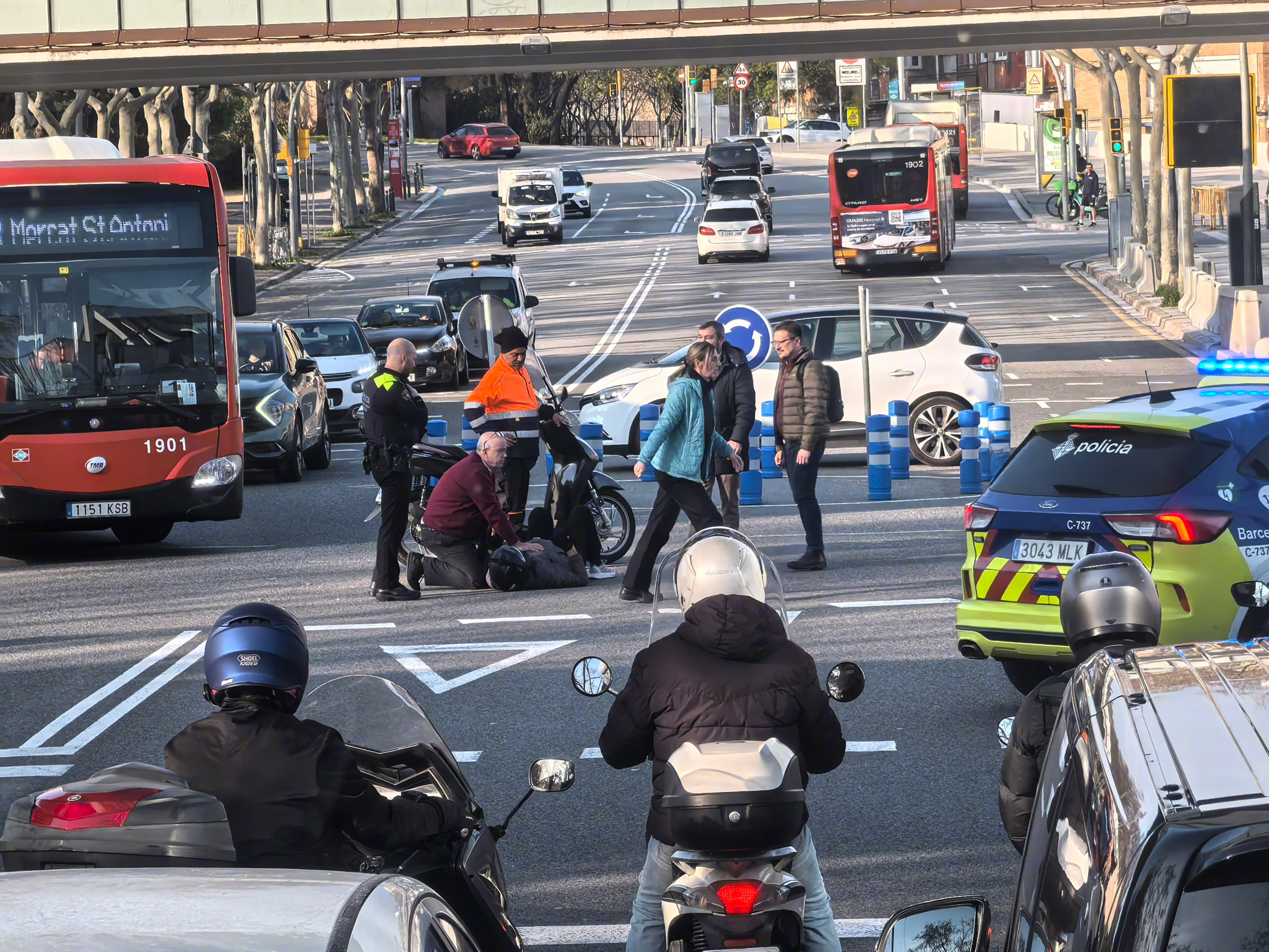 就在刚才,加泰罗尼亚国家艺术博物馆前面的十字路口,一个骑摩托的人倒下了。