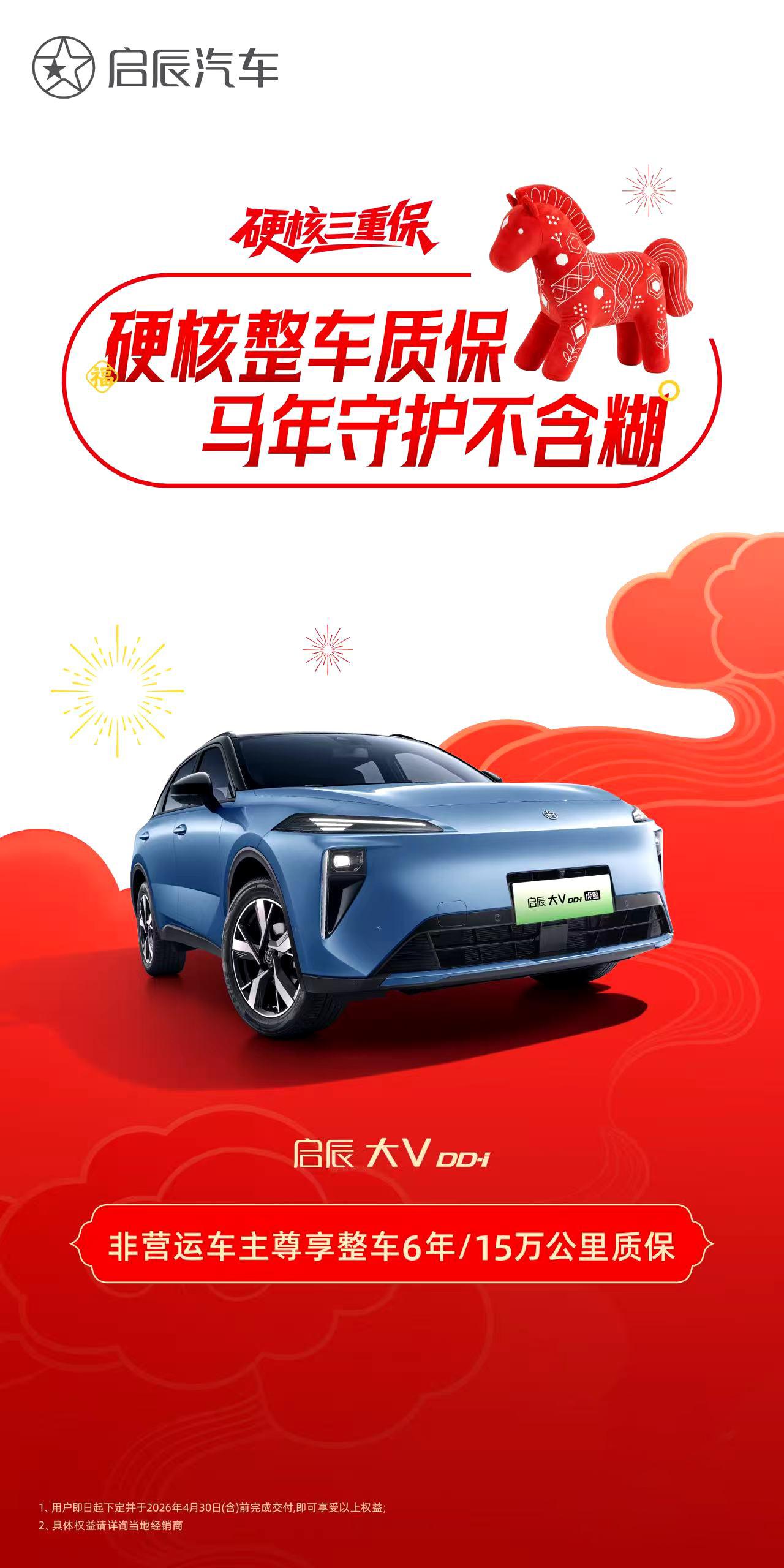 【启辰两款新能源车型推出多重用车保障】3月1日,启辰为旗下启辰VX6与2026款启辰大V DD-i虎鲸推出多重用车保障。启辰VX6为纯电 SUV,轴距2850mm,空间利用率较高,搭载高通骁龙8155芯片与灯塔OS 2.0车机系统。2026款启辰大V DD-i虎鲸为插电混动SUV,配备五连杆独立后悬架,CLTC纯电续航150km,综合续航1221km,30%~80%快充需21分钟。两款车型均依托东风日产制造体系与供应链体系生产。【来自懂车帝车友圈】