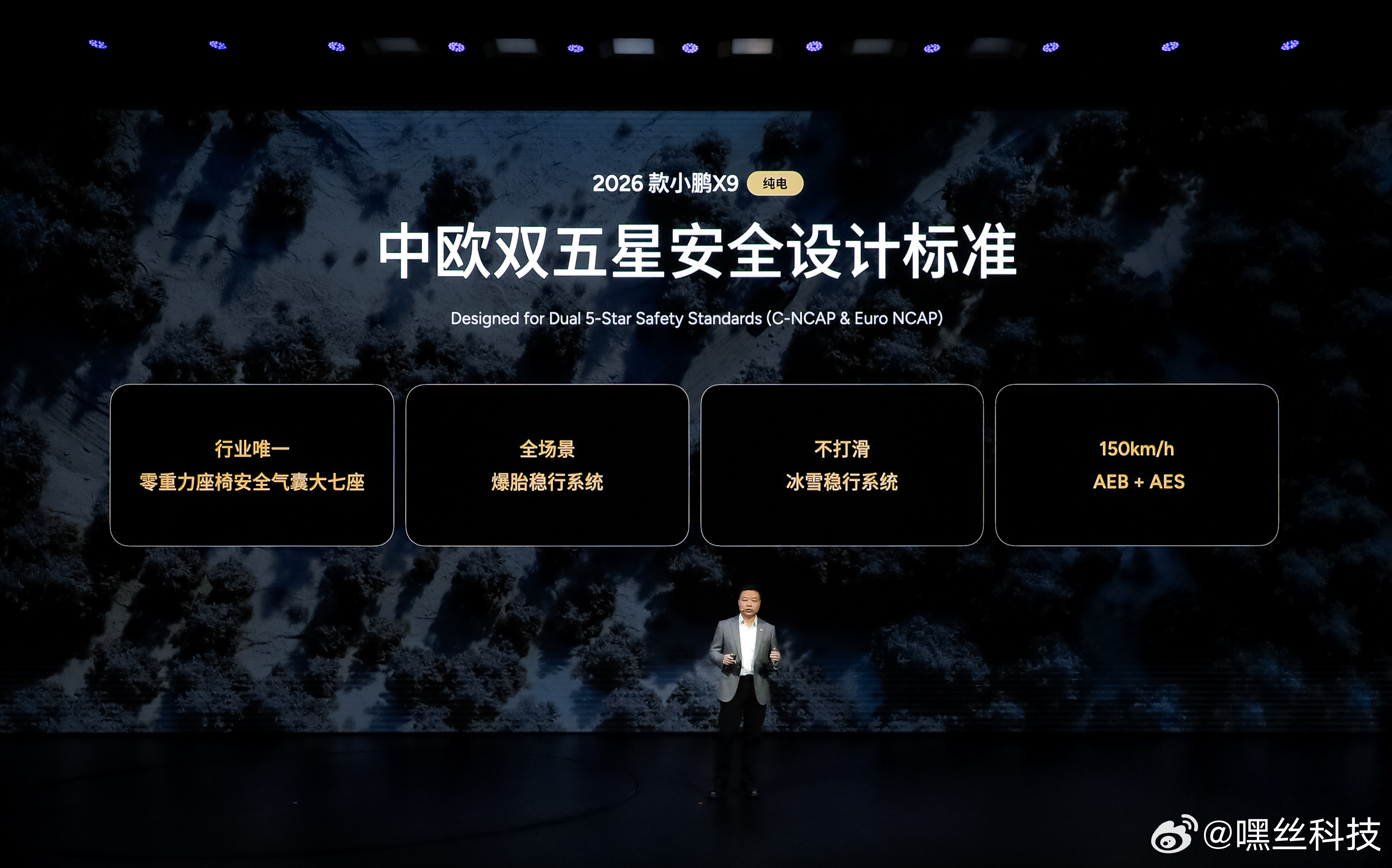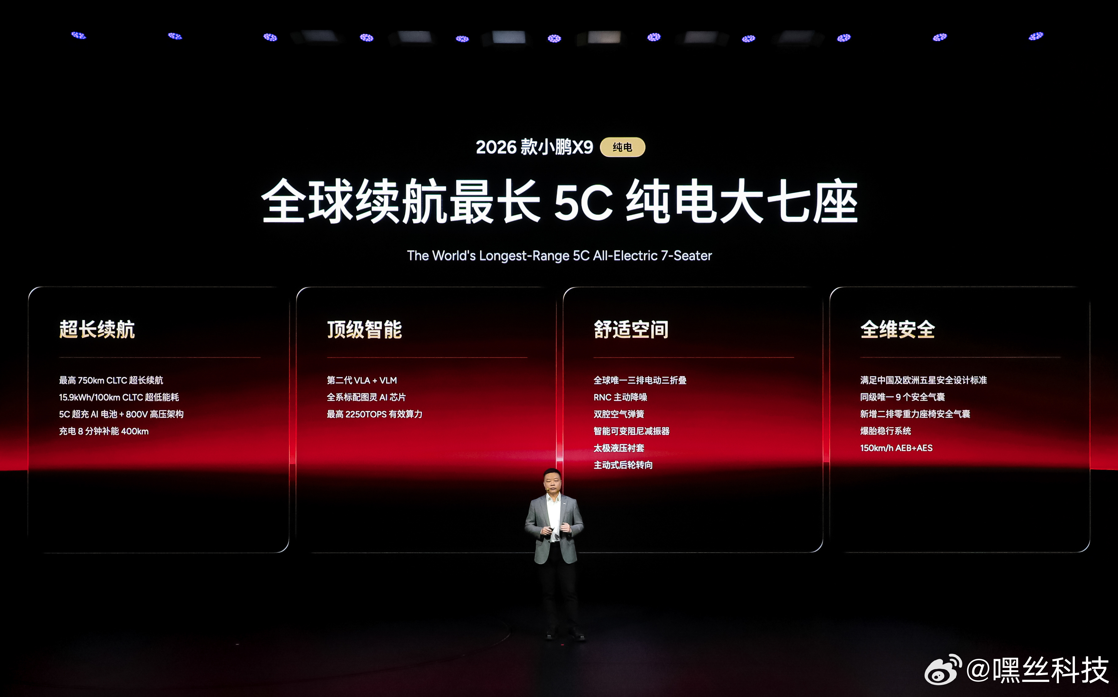 小鹏X9,登顶2026年1月新能源MPV销量冠军!26款小鹏X9纯电全面对齐增程:1.全球最长续航:全系标配800V+5C超充,CLTC纯电续航最高达750km,10%-80%补能仅需11.7min;2.L4级智能:全系标配图灵AI芯片(算力高达2250TOPS)和第二代VLA物理世界大模型,智驾能力全面进化;3.全能空间:全球首发三排电动折叠、同级唯一带安全气囊的零重力座椅及百万太极AI底盘,真正实现“一车变四房”;4.全维安全:全系标配同级唯一全车9安全气囊、极端全场景爆胎稳行、高速避障稳行;同时满足中欧五星设计标准,构筑五星安全防护体系。小鹏智驾负责人称拉开差距的时刻到了