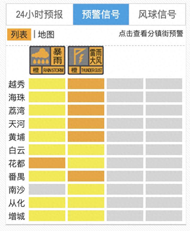 截至3月2日15时05分,花都区发布了暴雨橙色预警信号,越秀区、天河区、白云区、从化区、海珠区、黄埔区、荔湾区、番禺区、增城区发布了暴雨黄色预警信号;越秀区、天河区、海珠区、荔湾区、番禺区发布了雷雨大风橙色预警信号,白云区、从化区、黄埔区、花都区、南沙区、增城区发布了雷雨大风黄色预警信号。
