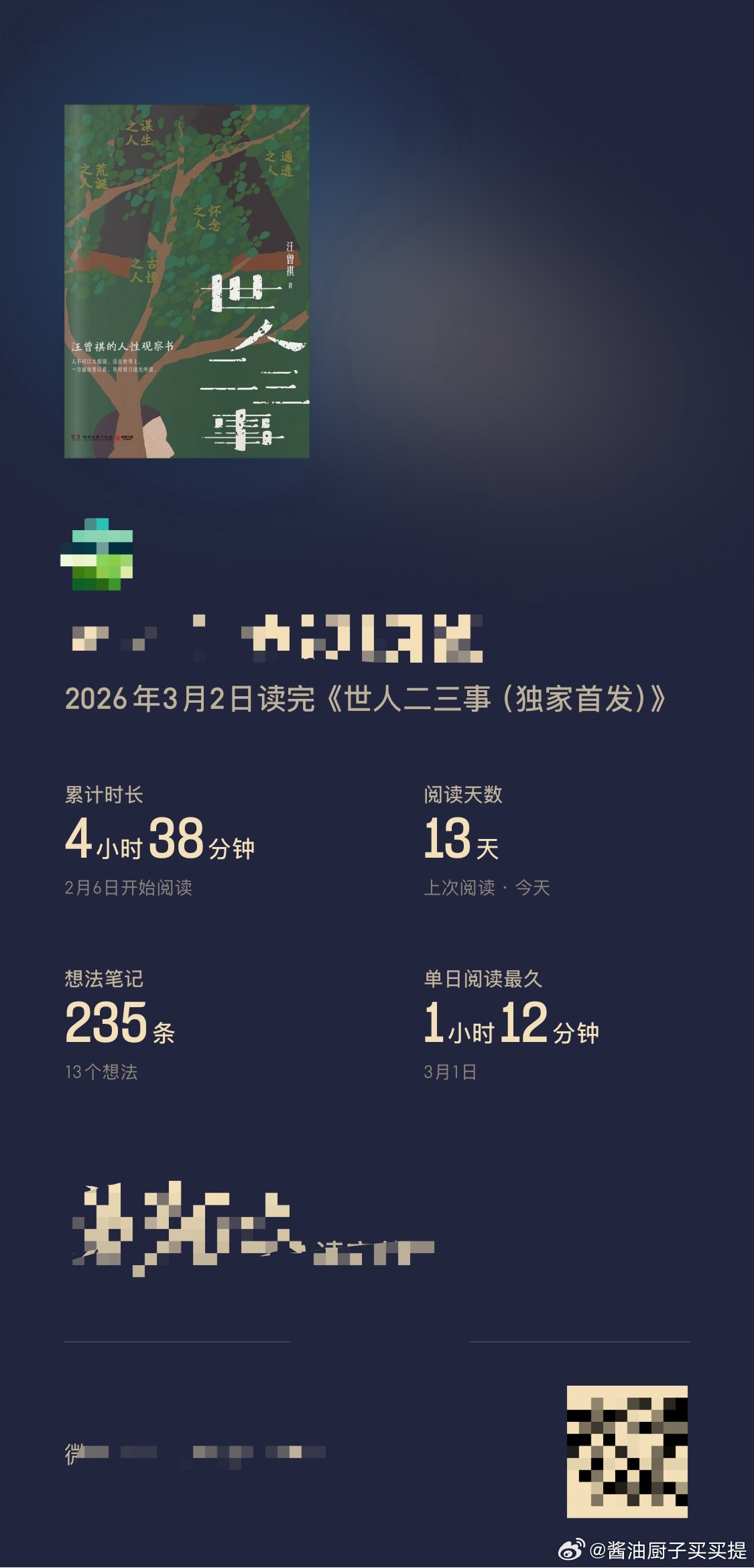 3️⃣《世人二三事》汪曾祺汪曾祺的文字真的很能让人平静,有种抚平了我的川字纹的感觉哈哈哈哈文字非常平易近人,怪不得有人评价他的风格不像大海,像河流,写的都是普通人、平常事、小日子:手艺人、街坊邻居、旧友故人、市井烟火、草木虫鱼……没有惊天动地,没有爱恨情仇,只有淡淡的、温温的、活着本来的样子。每晚睡前看一个小章节,真的是很愉快的阅读体验。同时,也从他的笔下看到了以前语文课本中熟悉的作家生活的痕迹,比如沈从文、老舍、金岳霖等等,也读到了汪曾祺先生小时候的趣事以及他和父亲、儿子中国式家庭却很不一样的父子之情,就像他的父亲所说“多年父子成兄弟”,也许正是这种好的原生家庭情感,给了他许多的滋养,即使在面对后来人生的坎坷和打击的时候,也能够从容面对。今年好想去高邮吃咸鸭蛋啊