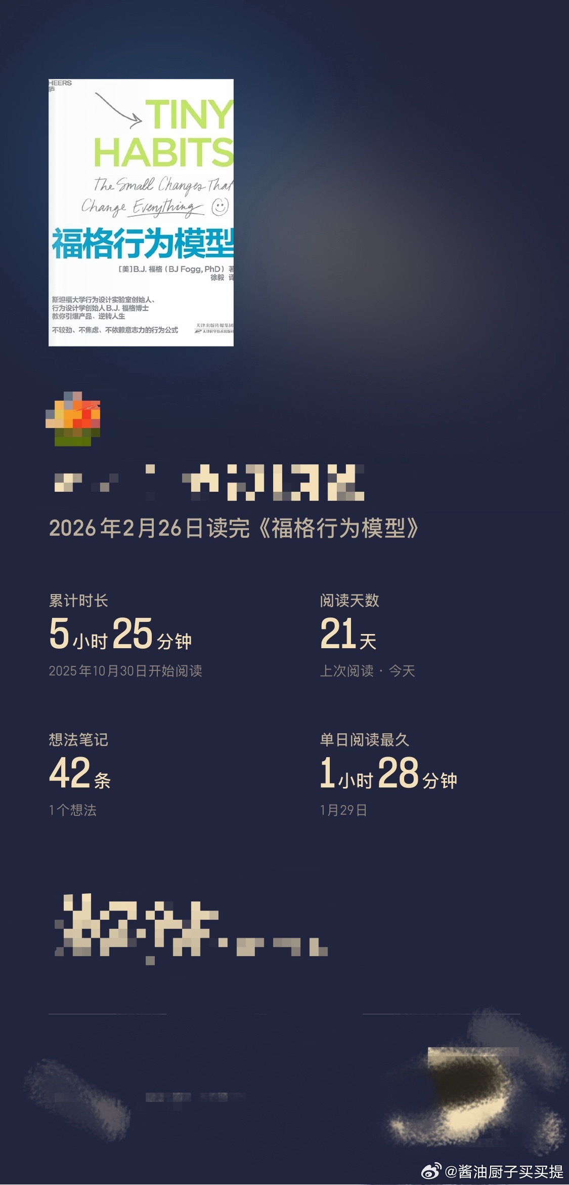 “有眼人解决不了的难题,只能找瞎子了;又说,正经解决不了的问题,只能找胡说了。”“眼前的事,已经把过去的事遮过去了。”“叫‘一日三秋’,就是一日不见,如隔三秋的意思,这在人和人之间,是一句顶一万句的话呀。”“这是本笑书,也是本哭书,归根结底,是本血书。多少人用命堆出的笑话,还不是血书吗?……”“这辈子让你知道了,下辈子也让你知道了,活着还有什么意思呢?都说要活个明白,真让你明白了,你也许就不想活了。”“活到这个年龄了,想起过去许多糟心事,当时桩桩件件,都觉得事情挺大,挺不过去了,现在想想,都是扯淡。”2️⃣《福格行为模型》改变当下从每一个微小的习惯开始。“愿望从来不会改变现实,行动才会。”“我发现能带来持久改变的只有3件事:经历顿悟、改变环境、从细微之处着手改变自身习惯。”