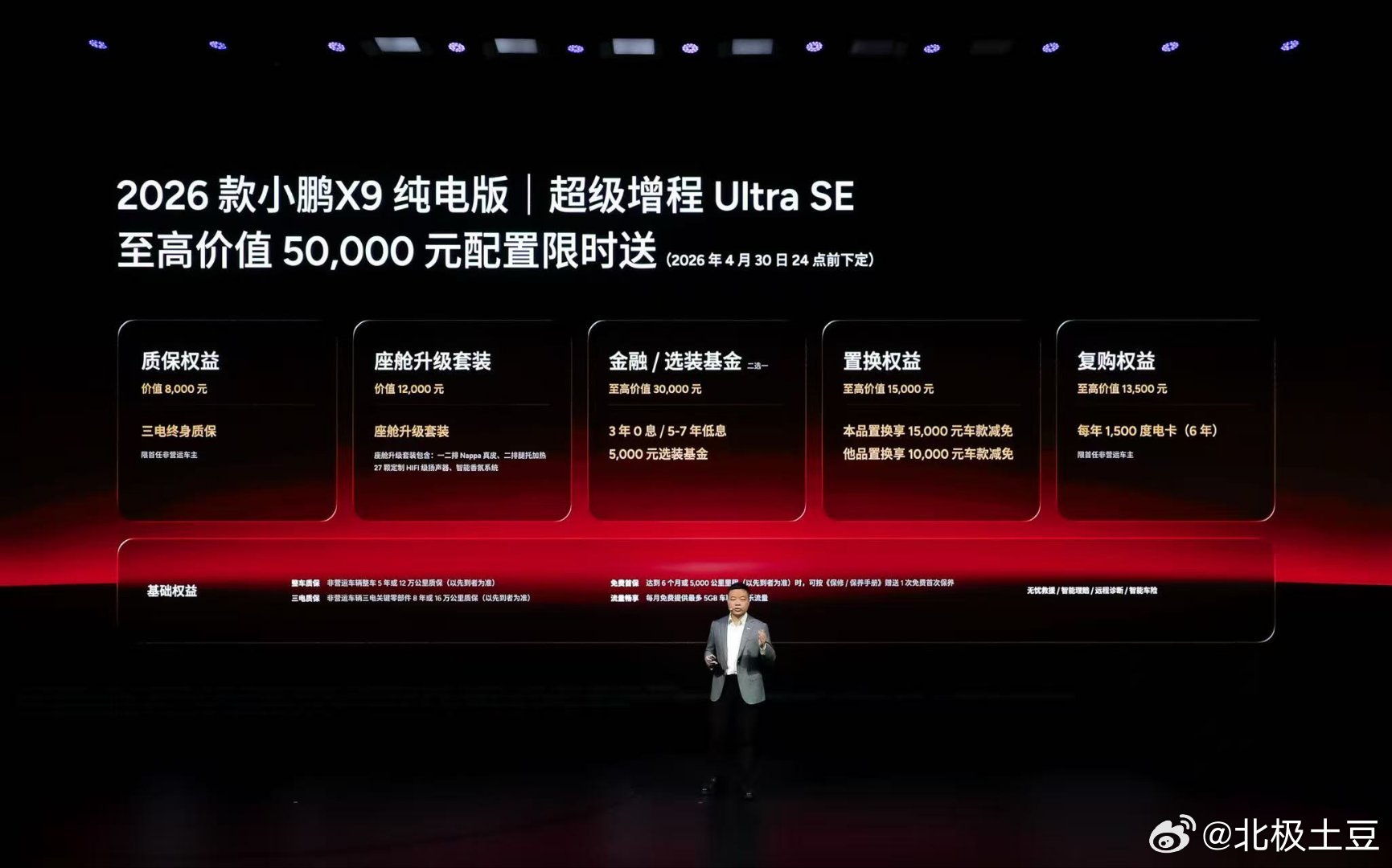 小鹏智驾负责人称拉开差距的时刻到了新款小鹏X9纯电版上市30.98万起30.98万元起,2026款小鹏X9纯电版重磅上市新车共推出5款版型,包括665 Max、650 Ultra SE、650 Ultra、750 Ultra以及710 四驱Ultra,官方指导售价分别为30.98万元、32.18万元、32.98万元、34.98万元、36.98万元2026款小鹏X9超级增程新增1602 Ultra SE版本,价格为32.18万元。即日起至2026年4月30日24点(含)前下定2026款小鹏X9纯电版,可享最高价值50,000元 权益限时送,包含三电终身质保、价值12,000元的座舱升级套装、至高价值30,000元金融/选装基金、至高价值15,000元置换权益以及每年1500度电卡(6年)的复购权益。2026款小鹏X9超级增程权益与2026款纯电版权益一致(2026年3月31日24:00前下定)此外24和25款的X9车主置换26款X9可以获得额外1万元的代金券补贴。(2025年11月20日已发放)还有早鸟权益限时返场,3月2日22点(含)前下定全车系,可享受2000元抵7000元购车款权益。