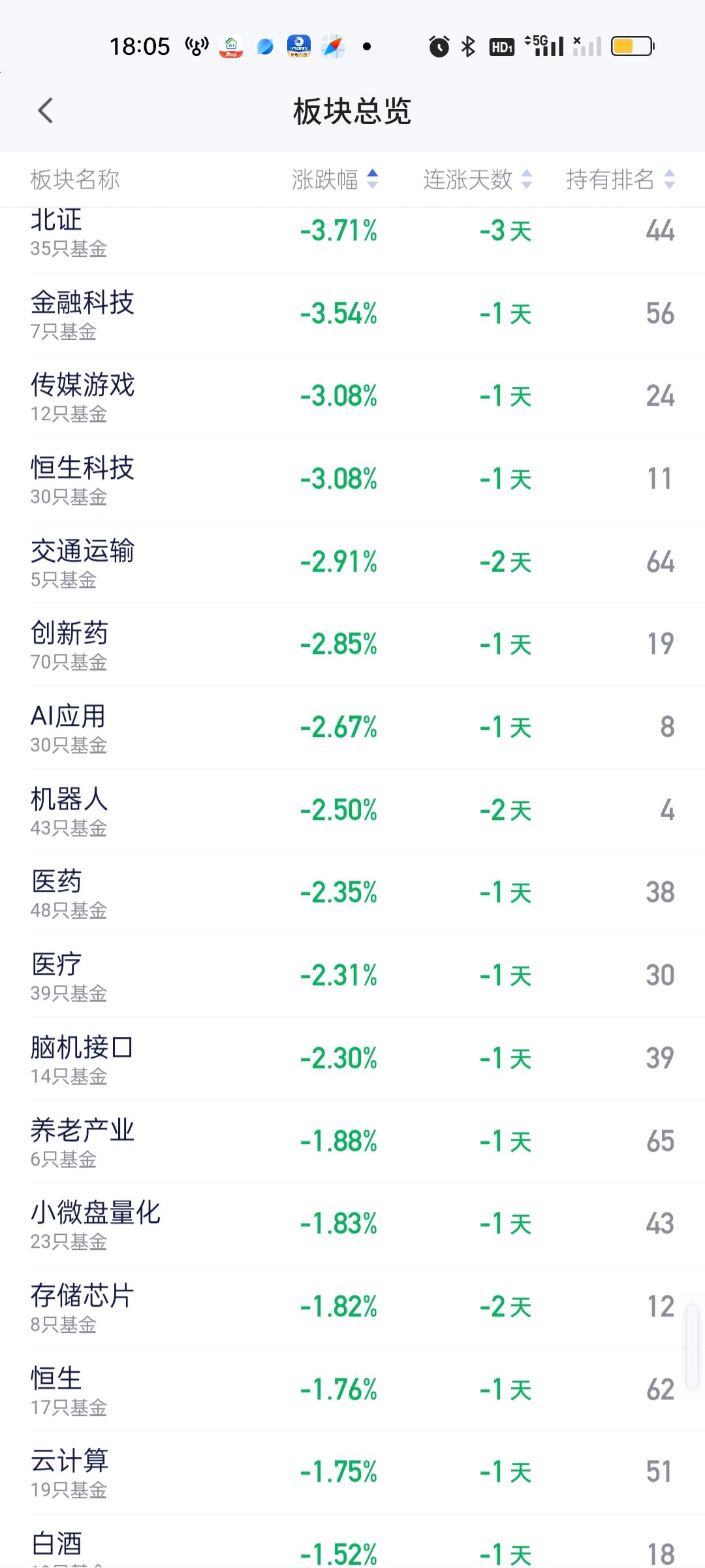 从板块涨跌榜来看,黄金,油气资源,有色金属,煤炭, CPO,通信,军工,商业航天,化工涨幅靠前。北证,金融科技,传媒游戏,恒生科技,交通运输,创新药,AI应用,机器人,医药,医疗,脑机接口,跌幅居前。