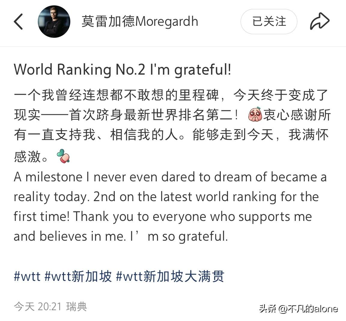3月2日,莫雷加德发文说:“世界排名第二,我心怀感激!” 小莫更新了一张图片,他双手抱着头,脸上笑开了花,他也没想到自己能跻身世界排名第二。 小莫感谢大家对他的支持,我也一直很喜欢他,因为他和东东是好朋友。 莫雷加德和樊振东都是萨尔布吕肯俱乐部的队员,东东不开心时,小莫还逗东东笑,真是个值得交心的好朋友。 小莫人长得帅,性格又幽默,希望他能打出更好的成绩,大家觉得呢?