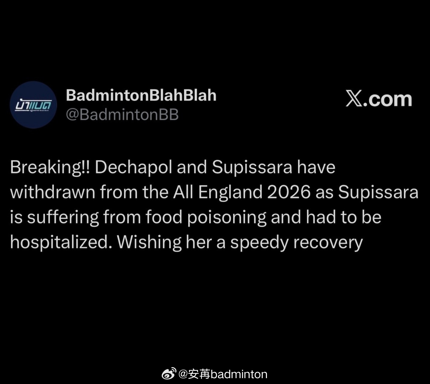 据泰媒报道:突发消息! 因搭档苏皮萨拉(Supissara)突发食物中毒并入院治疗,德差波(Dechapol)与苏皮萨拉已退出2026年全英羽毛球公开赛。祝愿她早日康复!