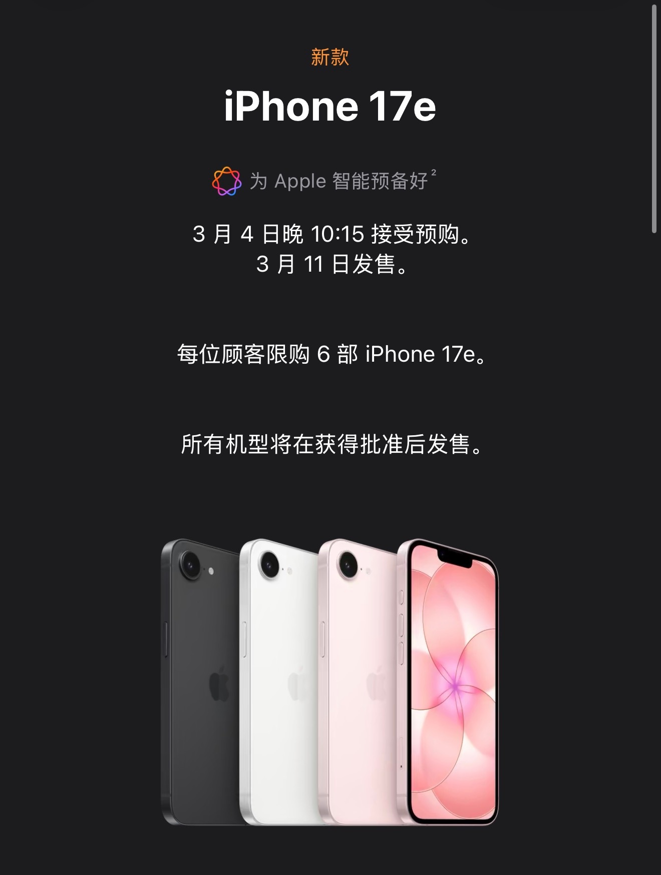 iPhone 17e 正式发布。A19 处理器,无高刷,无灵动岛。三个颜色,粉红
