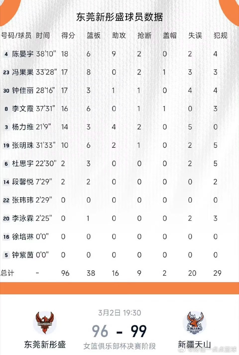 今天晚上2026女篮俱乐部杯这出戏,今天真的把球迷心脏都快折腾停了!广东女篮对阵新疆,原本一手好牌打得那叫一个揪心,最终愣是从领先15分的优势局,变成96-99的加时惜败,这锅谁来背?第四节本该是收比赛的节奏,广东却直接开启“青年军练兵模式”,杨力维等核心老将悉数雪藏,全靠年轻小伙儿在场上硬扛。要知道当时广东可是手握15分的巨大优势,这种轮换操作直接把主动权拱手让给了新疆!新疆队哪能放过这机会?钟佳丽一记超远三分强行续命,硬生生把比赛拖入加时!加时赛里,广东年轻阵容经验欠缺的短板彻底暴露,关键球处理畏手畏脚,防守强度也掉了链子,新疆抓住机会完成逆转,广东只能无奈吞下这场让人捶胸顿足的失利。虽然杨力维出战21分钟就砍下14分3篮板4助攻2抢断的全面数据,但末节和加时的枯坐板凳,也让球迷满是疑惑:练兵和胜率,到底该怎么平衡?年轻队员敢打敢拼是好事,但在关键赛事里交这样的“天价学费”,确实太可惜了。广东女篮这份遗憾,希望能变成后续成长的养分,下次可别再把好局拱手让人了!广东女篮广东女篮