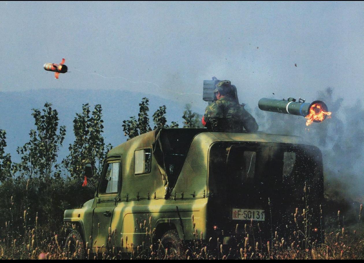 八十年代我军的明星导弹武器,红箭八号反坦克导弹,典型的二代反坦克导弹。据说当时是借鉴参考欧洲的米兰导弹研制的,而这些米兰导弹,是和陆航的第一批武装直升机法制瞪羚直升机引进国内的。红箭八号的有线制导方式,作用距离较短,使用BJ212吉普车进行机动防御,是我陆军步兵部队最有力的反装甲手段。