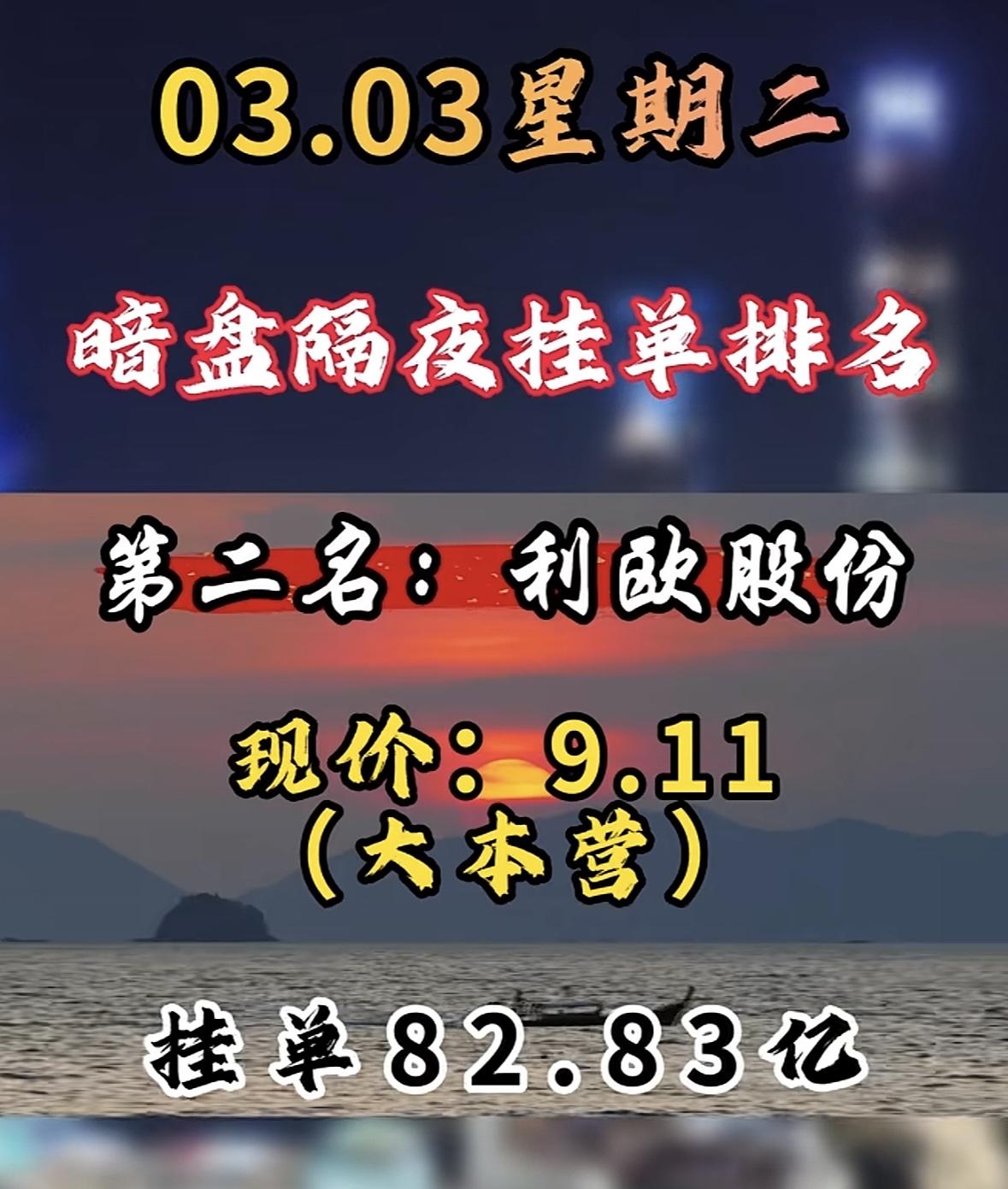 3月2日暗盘隔夜挂单前8名个股梳理,利欧股份3月2日暗盘交易信息,现价9.63,