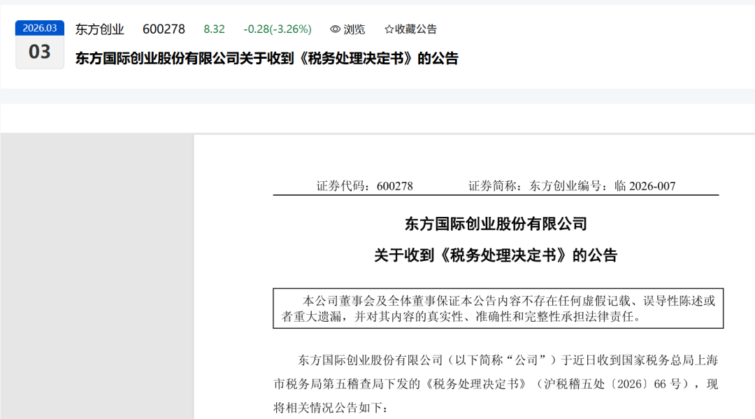 东方国际创业股份有限公司(以下简称“公司”)于近日收到国家税务总局上海市税务局第五稽查局下发的《税务处理决定书》(沪税稽五处〔2026〕66号),现将相关情况公告如下: