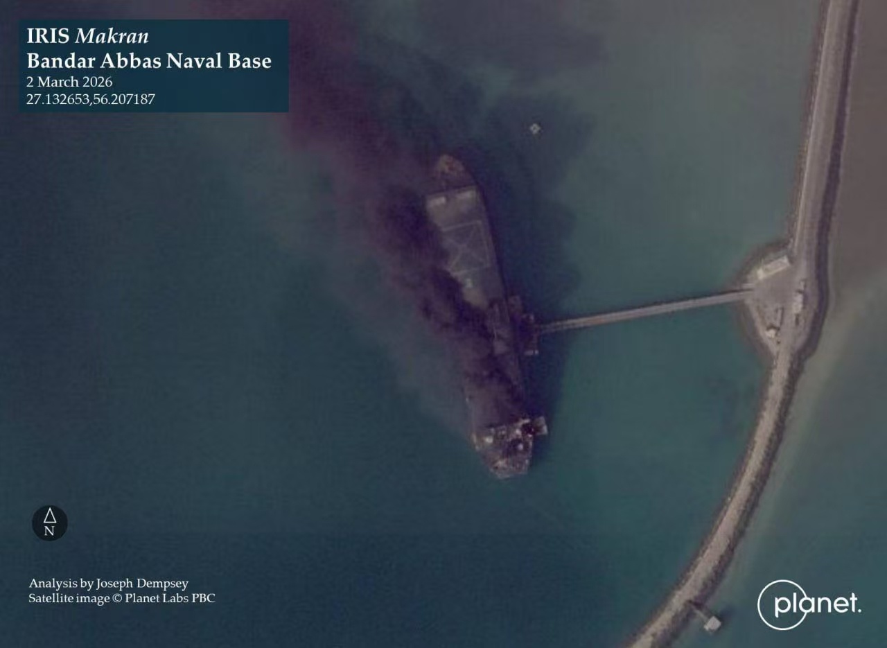 伊朗革命卫队海军的浮动基地"马克兰"号,在阿巴斯港海军基地附近的水域遭到打击。这个浮动基地是由一艘油轮改装的。