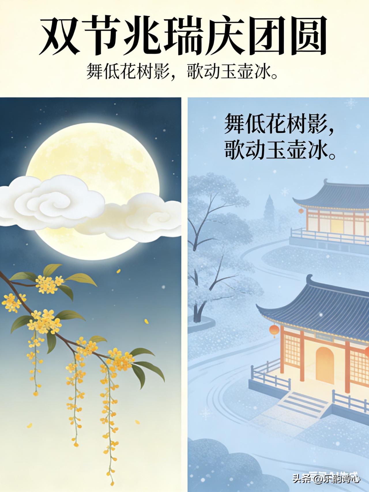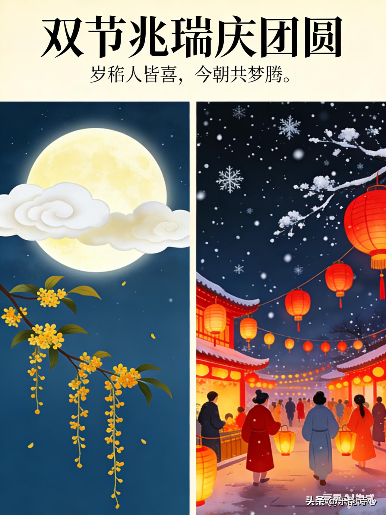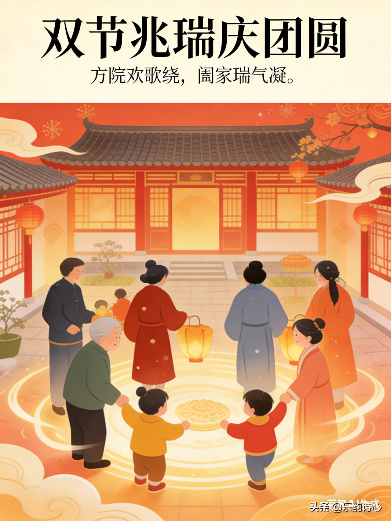 《双节兆瑞庆团圆》乐韵诗心原创诗词: 中秋云隐月,元夕雪盈灯。 方院欢歌绕,阖家瑞气凝。 舞低花树影,歌动玉壶冰。 岁稔人皆喜,今朝共梦腾。 这首诗词的首句“中秋云隐月,元夕雪盈灯”巧妙化用俗语,点明中秋云遮月与正月十五雪打灯的景象,暗示今年是好年景。颔联描绘家中欢歌萦绕,祥瑞之气凝聚,尽显团圆温馨。颈联中“舞低花树影”写舞姿曼妙,“歌动玉壶冰”以冰喻歌声热爱与憧憬。