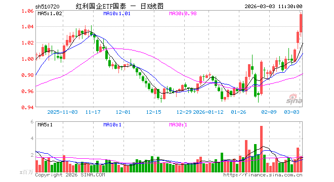 3月3日,截止午间收盘,红利国企ETF国泰(510720)涨2.13%,报1.055元,成交额1.91亿元。红利国企ETF国泰(510720)重仓股方面,中远海控截止午盘涨6.09%,山煤国际跌0.25%,平煤股份涨0.56%,潞安环能涨1.75%,恒源煤电涨2.09%,陕西煤业涨1.53%,西部矿业跌3.97%,兖矿能源涨6.84%,四川路桥涨0.00%,厦门国贸涨1.33%。