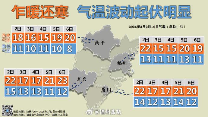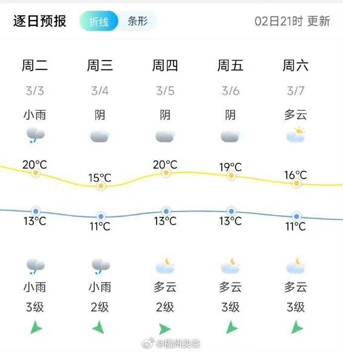 【冷空气来了!福州气温又要降!福建天气频繁“变脸”】 2日,福州迎来了久违的阳光,多地气温甚至升至27℃以上!不过,冬装暂时别急着收,因为新一轮冷空气已经抵达,即将带来降温。据福州气象消息,这股冷空气已经于2日16:51过境福州主城区鼓楼乌山国家地面气象观测站,并于20:29过境福州晋安区晋安国家地面气象观测站。受其影响,3日气温将有所下降,请大家注意适时添衣保暖。根据最新预报,未来几天福州市区最高气温都不会超过20℃,最低气温将降至11℃左右,同时伴有降雨,出门请随身携带雨具,做好防雨准备。via福州气象 福州天气