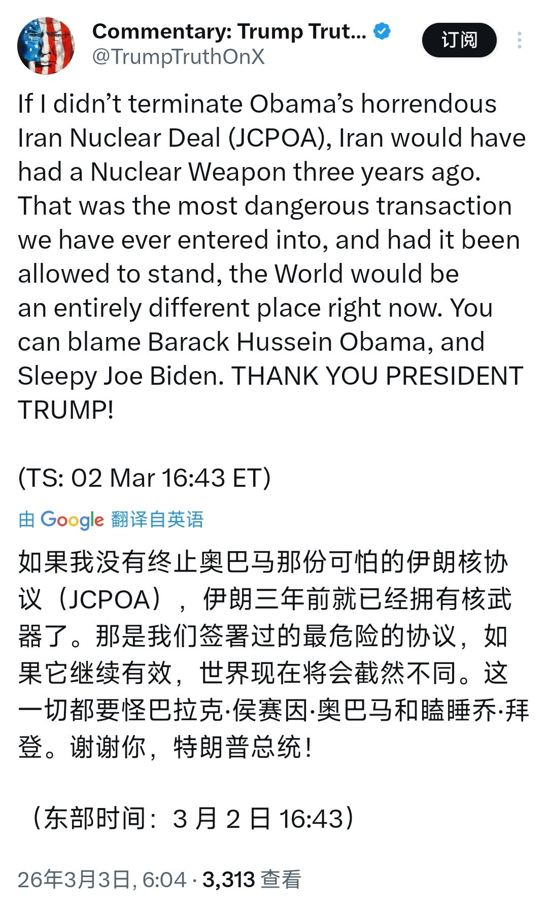 特朗普北京时间3月3日发文写道:“如果我没有终止奥巴马那份可怕的伊朗核协议(JCPOA),伊朗三年前就已经拥有核武器了。那是我们签署过的最危险的协议,如果它继续有效,世界现在将会截然不同。这一切都要怪巴拉克·侯赛因·奥巴马和瞌睡乔·拜登。谢谢你,特朗普总统!” 这份伊朗核协议,它可不是特朗普嘴里说的“最危险的协议”,而是2015年,美国、中国、俄罗斯、英国、法国、德国和伊朗一起谈判达成的,全称是《联合全面行动计划》,目的就是约束伊朗的核活动,防止伊朗发展核武器,同时让伊朗能和平利用核能,国际社会当时都认可这份协议的有效性。 国际原子能机构(IAEA)一直对伊朗的核活动进行监督核查,在特朗普2018年单方面退出这份协议之前,核查结果一直显示,伊朗严格遵守了协议中的各项规定,没有偷偷发展核武器,更不存在“三年前就会拥有核武器”的情况。这是有明确报告佐证的,不是特朗普随便说说就能推翻的。 相反,正是特朗普在2018年不顾国际社会的反对,单方面退出了这份原本有效的协议,还重启并加码对伊朗的制裁,才导致伊朗的核活动不再受协议约束,开始加速生产高浓缩铀,让地区局势变得更加紧张。 后来国际原子能机构的报告也显示,在美方退出协议后,伊朗的浓缩铀产量才超过了协议限制,这都是特朗普的错误决策造成的。 特朗普现在却倒打一耙,把自己退出协议的错误行为,说成是“拯救世界”,还自夸自己阻止了伊朗拥有核武器,这纯属自我标榜,完全不符合事实。 他之所以这么说,说白了就是为了给自己脸上贴金,讨好自己的支持者,为自己的政治野心铺路,毕竟他一直都有再次竞选总统的想法,靠这种虚假宣传博眼球、拉选票,是他一贯的手段。 更让人不齿的是,特朗普在文中刻意写下奥巴马的全名“巴拉克·侯赛因·奥巴马”,特意夹带“侯赛因”这个中间名,可不是无心之举,而是别有用心。 大家都知道,“侯赛因”这个名字带有伊斯兰宗教色彩,特朗普这么做,就是想借宗教色彩恶意给奥巴马贴标签、搞暗示,暗示奥巴马和伊斯兰有联系,从而误导选民,唤起部分支持者对奥巴马的偏见。 这种做法非常卑劣,完全不顾及基本的尊重,早在多年前,特朗普就经常用这种手段攻击奥巴马,可见其心胸狭隘。 除此之外,特朗普还用“瞌睡乔”这个绰号肆意贬低现任总统拜登,这也是他的一贯操作。“瞌睡乔”这个称呼本身就带有嘲讽、不尊重的意味,特朗普一直用这个绰号称呼拜登,就是想通过贬低对手,抬高自己,彰显自己的“能力”,这种人身攻击的方式,尽显政客的虚伪和卑劣。 大家仔细想想就会明白,特朗普的这番发文,没有一句实在话,全是颠倒黑白的政治甩锅和拙劣的自我标榜。 他把自己退出伊朗核协议的错误,归咎到奥巴马和拜登身上,完全无视事实真相;他恶意使用奥巴马的中间名,刻意抹黑,又肆意贬低拜登,都是为了自己的政治利益,丝毫不管这种言论会带来什么影响,也不管是否会加剧美国内部的分裂和地区局势的紧张。 事实上,伊朗核问题之所以走到今天这个地步,核心原因就是特朗普单方面退出协议、实施极限施压政策。 特朗普退出协议后,美国对伊朗实施了全面制裁,涵盖石油出口、金融、航空等多个领域,不仅严重损害了伊朗的经济利益,让伊朗民众的生活受到影响,还加剧了中东地区的紧张局势,引发了一系列连锁反应。 后来,拜登政府曾试图重启伊核协议谈判,希望能重新约束伊朗的核活动,缓解地区紧张,但由于特朗普留下的烂摊子太多,加上各方分歧较大,谈判一直没有取得实质性进展。而特朗普现在却把这一切都怪到拜登头上,完全是无理取闹,把自己的责任推得一干二净。 特朗普的这番言论,明眼人都能看出其中的猫腻,他就是想通过这种卑劣的话术,混淆视听,误导民众,为自己的政治仕途铺路。 他不管什么事实真相,不管什么国际影响,只要能达到自己的目的,就可以颠倒黑白、恶意抹黑、自我吹嘘。 这种政客的卑劣手段,不仅遭到国际社会的质疑,也被美国国内不少有识之士批评。毕竟,一个合格的政治人物,应该以事实为依据,以国家利益和国际和平为重,而不是靠虚假宣传、恶意攻击、甩锅推责来博眼球、谋私利。 特朗普的这番发文,再次暴露了他的真实面目——眼里只有自己的政治利益,没有任何责任感和担当。他嘴里的“拯救世界”,不过是自我标榜的谎言;他所谓的“危险协议”,其实是维护国际和平与地区稳定的重要保障;他的甩锅和抹黑,不过是政客的拙劣表演。 说到底,特朗普就是想通过这种方式,讨好支持者,为自己的竞选造势,至于他的言论是否符合事实,是否会加剧矛盾,他根本不在乎。 这种不顾事实、只顾私利的卑劣话术,只会让更多人看清他的真面目,也只会让美国的形象受到更多损害。