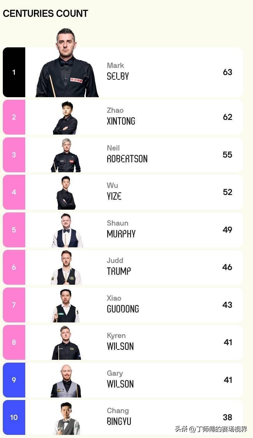 本赛季仅剩三项赛事,任何斯诺克选手若能在单赛季打出100杆破百,都将获得10万英镑的奖金。 目前,仅剩世界公开赛、巡回锦标赛和世界锦标赛三项赛事。马克·塞尔比以63杆破百领先,赵心童以62杆紧随其后,大概率是这两人争夺10万英镑了。 他们是本赛季仅有的两位能够拿下至少2冠的球手,一个是80后第一人,一个是中国第一战力,你认为他们两人能否在赛季结束前达成这一里程碑?