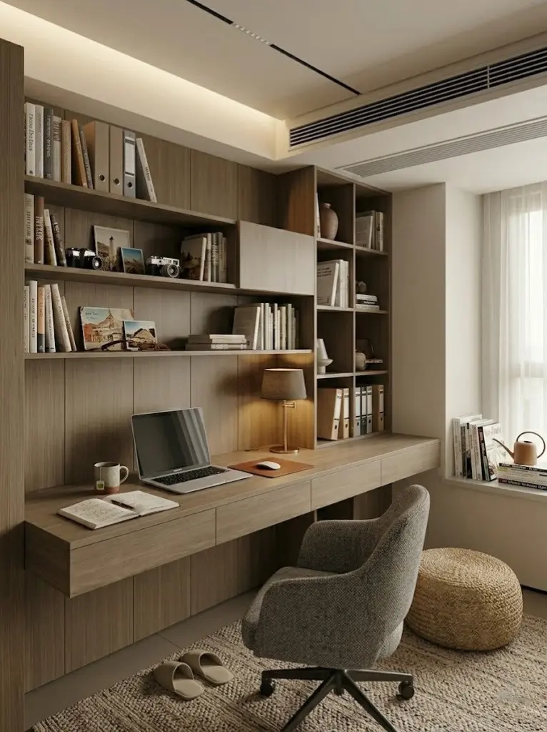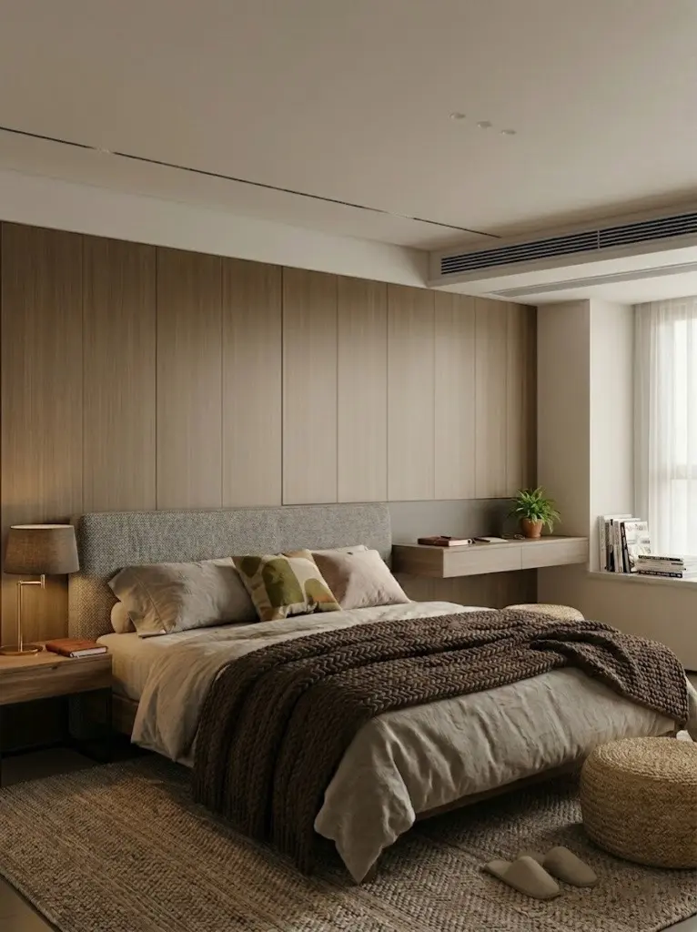 步入书房与卧室,延续了公区域的静谧调性。木质悬浮书桌搭配编织蒲团,打造出一个专注而放松的专属精神角落💻。主卧舍弃繁杂装饰,以沉稳的棉麻床品碰撞木作背景墙,营造极致的舒适助眠环境🛌。卫浴空间同样考究,原木色双台盆定制柜搭配百叶窗,光影斑驳间,在家就能享受治愈的沐浴时光🛁。